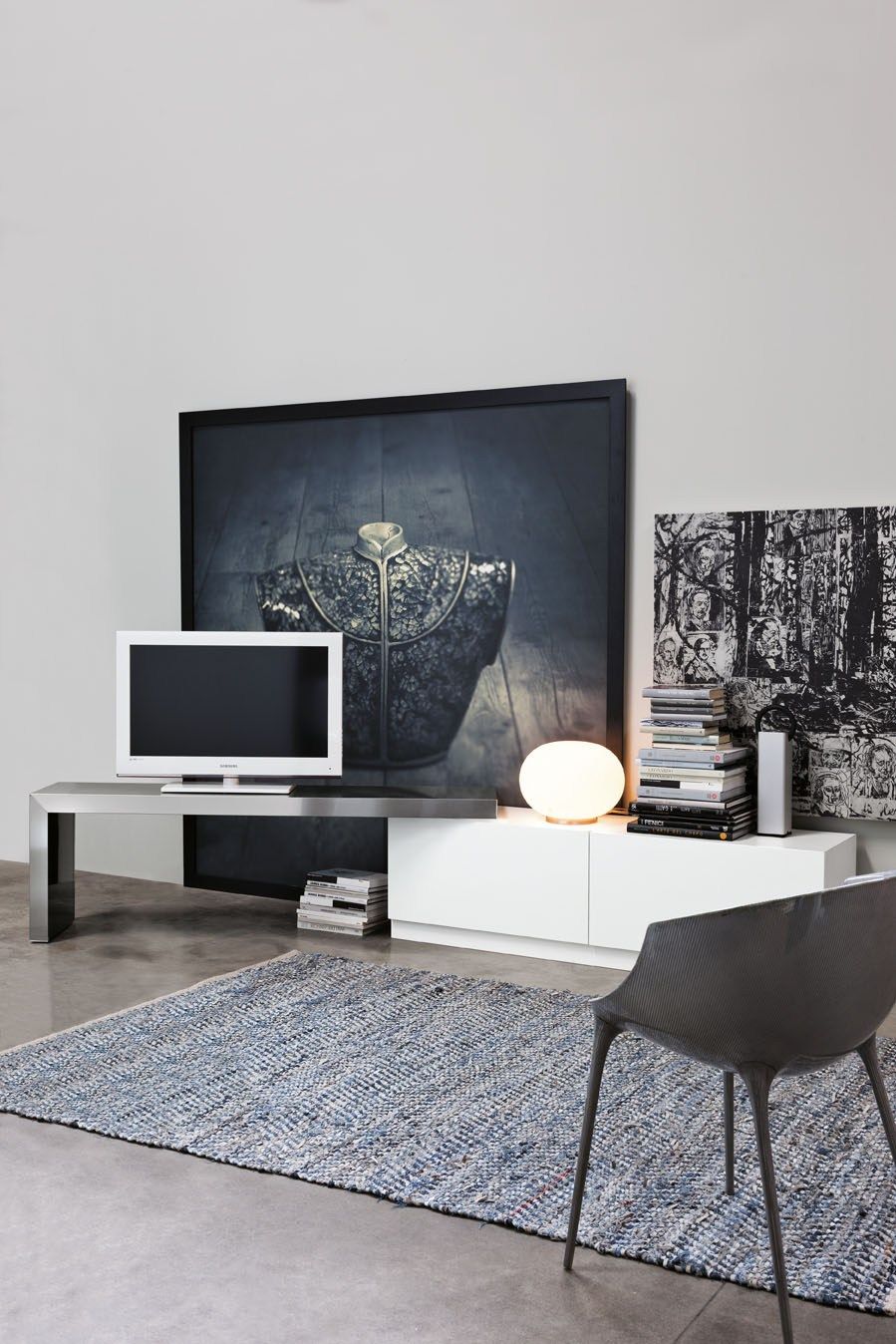 Kaj pravite na tole okroglo TV stojalo Vision, Bonaldo? Narejeno je iz lakiranega dulufleks materiala in kromiranega vrtljivega podstavka, drži pa lahko televizor z diagonalo do 102 cm. V režo med sprednjim in zadnjim panelom lahko shranite DVD-je, sicer pa je dovolj prostora tudi za ostale medijske elemente.