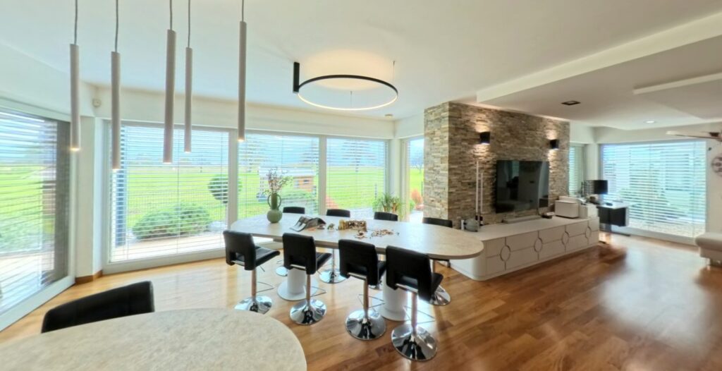 Galaktični elementi naredijo ambient zanimiv in drugačen, hkrati pa ne zasičejo dnevno-bivalnega prostora, kjer se družina zbira in druži. V jedilnem delu sta prav v ta namen postavljeni kar dve mizi – povečan in razširjen pult, ob katerem lahko tudi obedujejo, medtem ko se za jedilno mizo usedejo ob praznovanjih ali ko dobijo večje obiske.