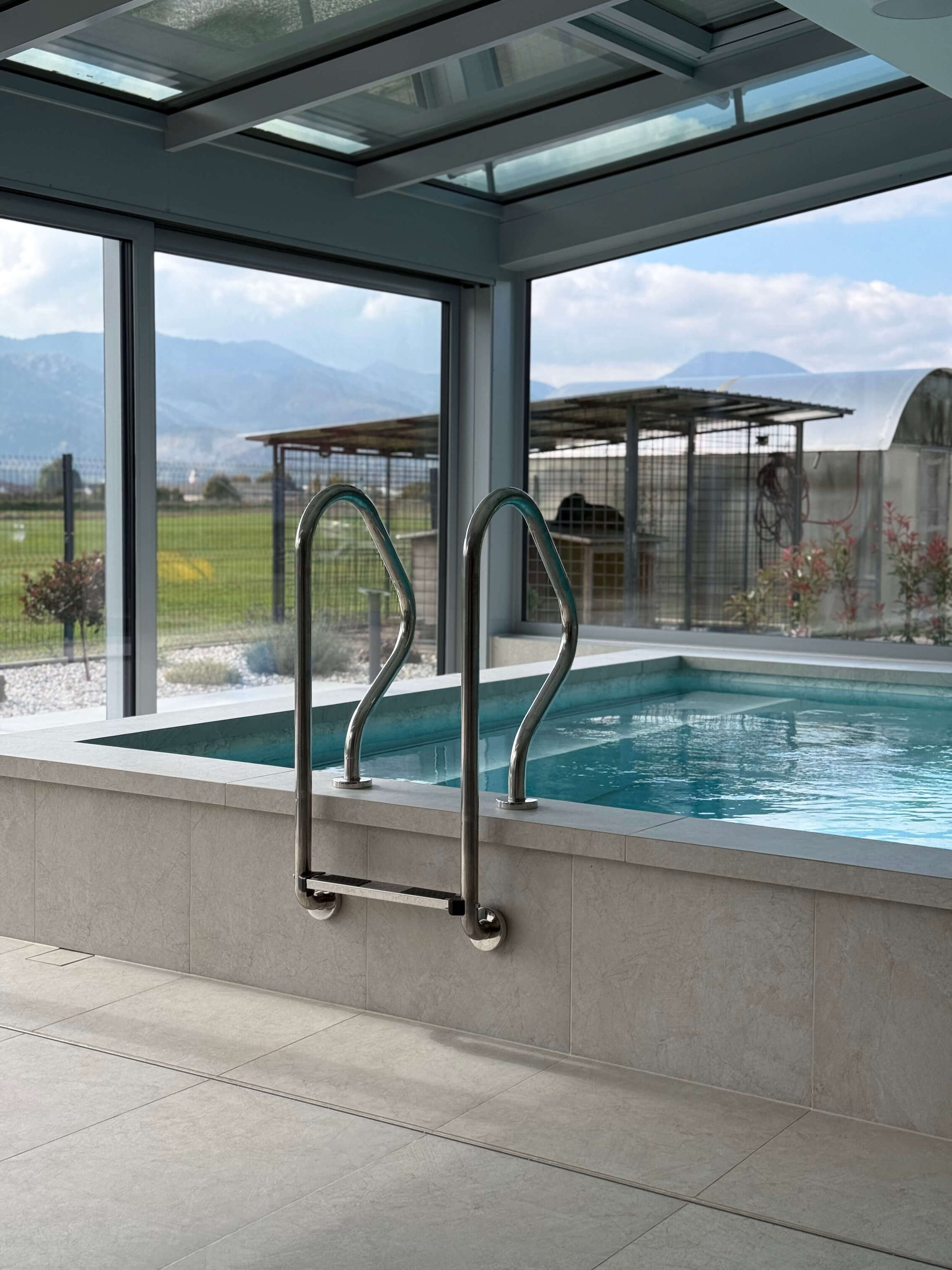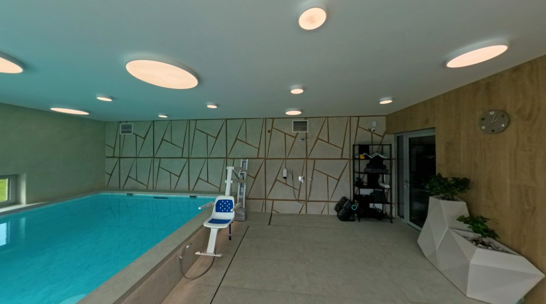 Daleč največji zalogaj prenove pa je bila dograditev prizidka z bazenom. Mineva namreč že 30 let, odkar je Bogdan na vozičku, kar je pustilo posledice na njegovem telesu. »Zame sta edino plavanje in voda tisto, s čimer lahko vzdržujem minimum fizične pripravljenosti in kondicije za življenje, zato je bila kar nekaj let želja po bazenu. Najprej je bila sicer ideja o plavalni banji, potem smo pa skozi projekt prišli do zidanega notranjega bazena, ki ga lahko uporabljamo skozi celo leto,« pove in dodaja, da je prizidek z bazenom za sabo potegnil tudi vgradnjo inštalacij, povezanih s pripravo kopalne vode, z ogrevanjem in razvlaževanjem zraka ter s talnim ogrevanjem. »V tem smislu smo prenovili in razširili tudi našo kotlovnico oziroma strojnico z dodatno geotermalno ogrevalno toplotno črpalko in vse skupaj povezali v preprost sistem za uporabnika.«
