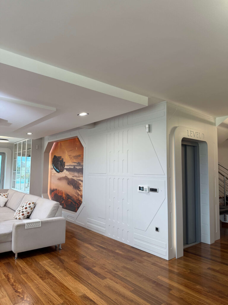 V ambient so vpeljali več elementov iz vesolja. Okno s tapeto za sedežno garnituro denimo ponazarja vesoljsko ladjo, stena je oblečena v modularne panele z geometričnimi vzorci, omislili so si za ta stil tipična avtomatska drsna vrata. V prehodnem delu opazimo tudi dve razsvetljeni vitrini s serijami sestavljenih Lego kock Star Wars, medtem ko se detajli najdejo celo na fasadi in oznakah vrat v kopalnico.