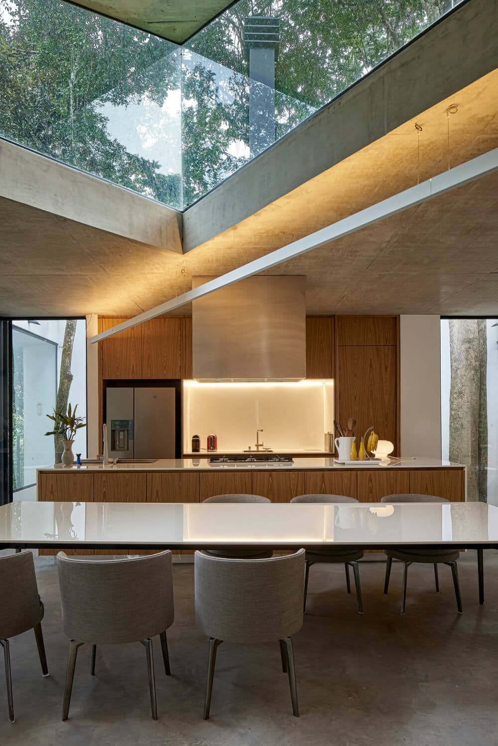 Arhitekti povedo, da so želeli arhitekturo brezšivno spojiti s krajino, in ne obratno. Kot takšna se hiša elegantno dviga iz tal in dovoljuje vibrantni flori in favni, da uspevata pod njo. Za postavitev hiše niso posekali nobenega drevesa niti niso preoblikovali topografije parcele. Je kot umetniško delo, ki se oblikuje okoli narave. Fluidni tloris s številnimi zalomi se z velikimi odprtinami odpira na krošnje dreves, številni zunanji elementi pa omogočajo sobivanje z naključnimi obiskovalci ‒ pticami pevkami, barvitimi metulji, kdaj pa kdaj pa na obisk zaide tudi kakšna opica.