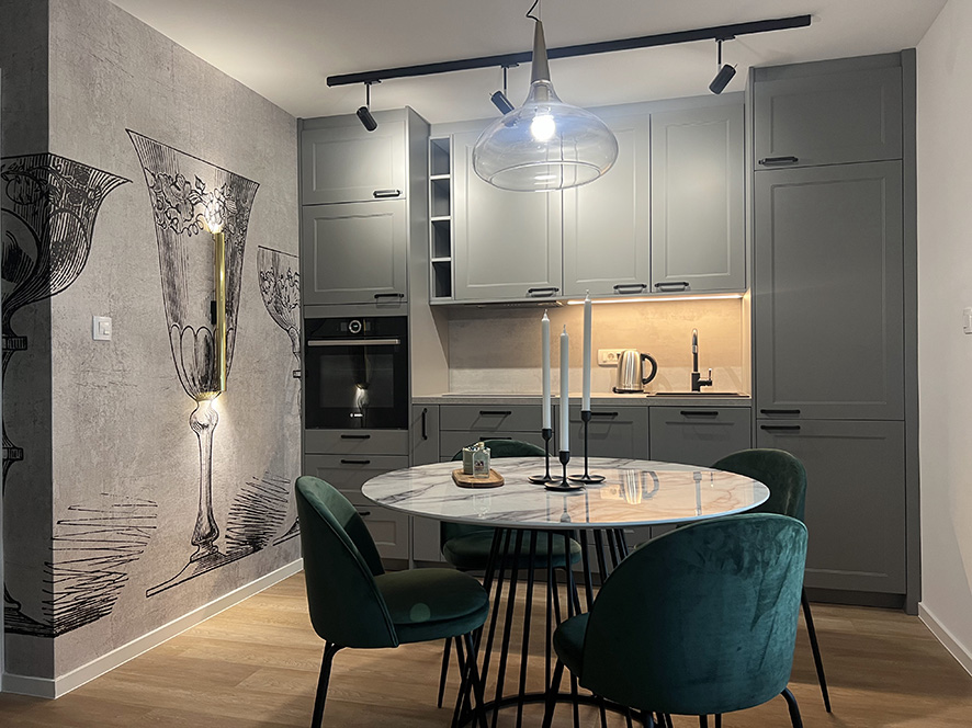 Podobno je arhitektka Tina Hočevar osvežila staro atrijsko hišo iz poznih sedemdesetih let z novim tlorisom in barvitim pohištvom. »Hiša je imela zelo veliko lesenih oblog, želja investitorja pa je bila, da jo vseeno naredimo sodobno, odprto, svetlo. Zato smo večino lesenih oblog odstranili, obdržali pa smo vidno leseno strešno konstrukcijo in speskali opečni zid.« Prenovljeno lupino so nato ‒ pod taktirko tako lastnice in arhitektke ‒ napolnili z drznimi kosi barvite opreme, ki odraža slog desetletja, v katerem je bila hiša postavljena.