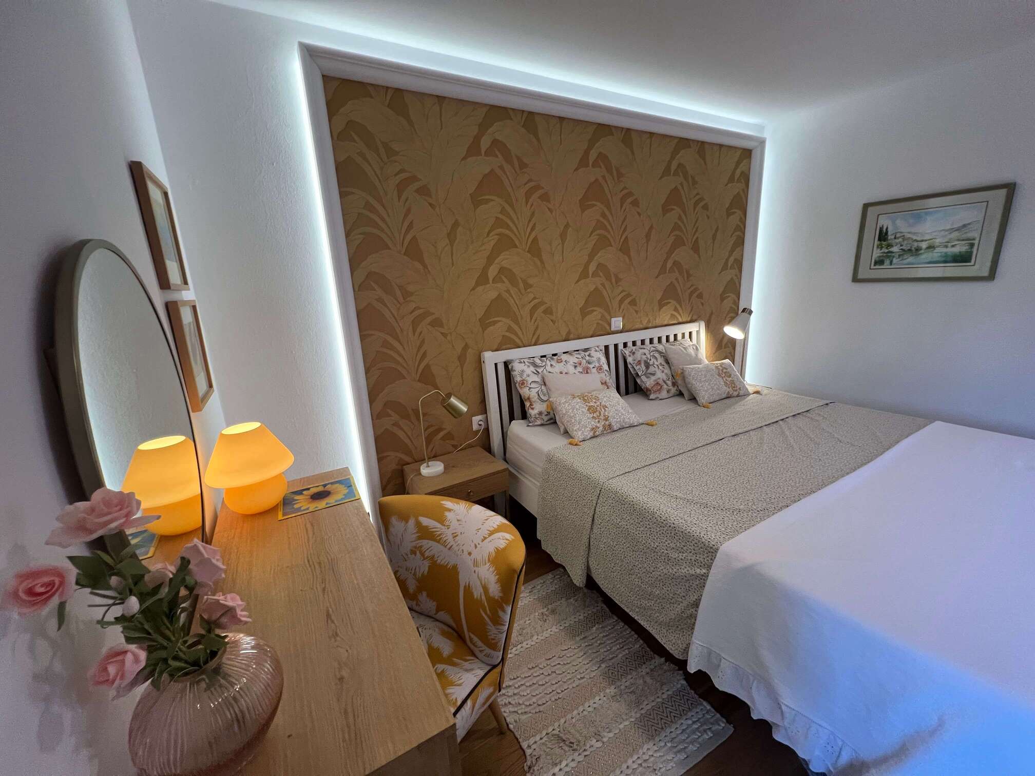 Tako so na primer v obeh spalnicah ostale stare postelje, ki pa so jih nadgradili in jim dodali mogočen okvir, po steni so položili tapeto in z nadsvetlobo oziroma ambientalno svetlobo prostora oplemenitili.