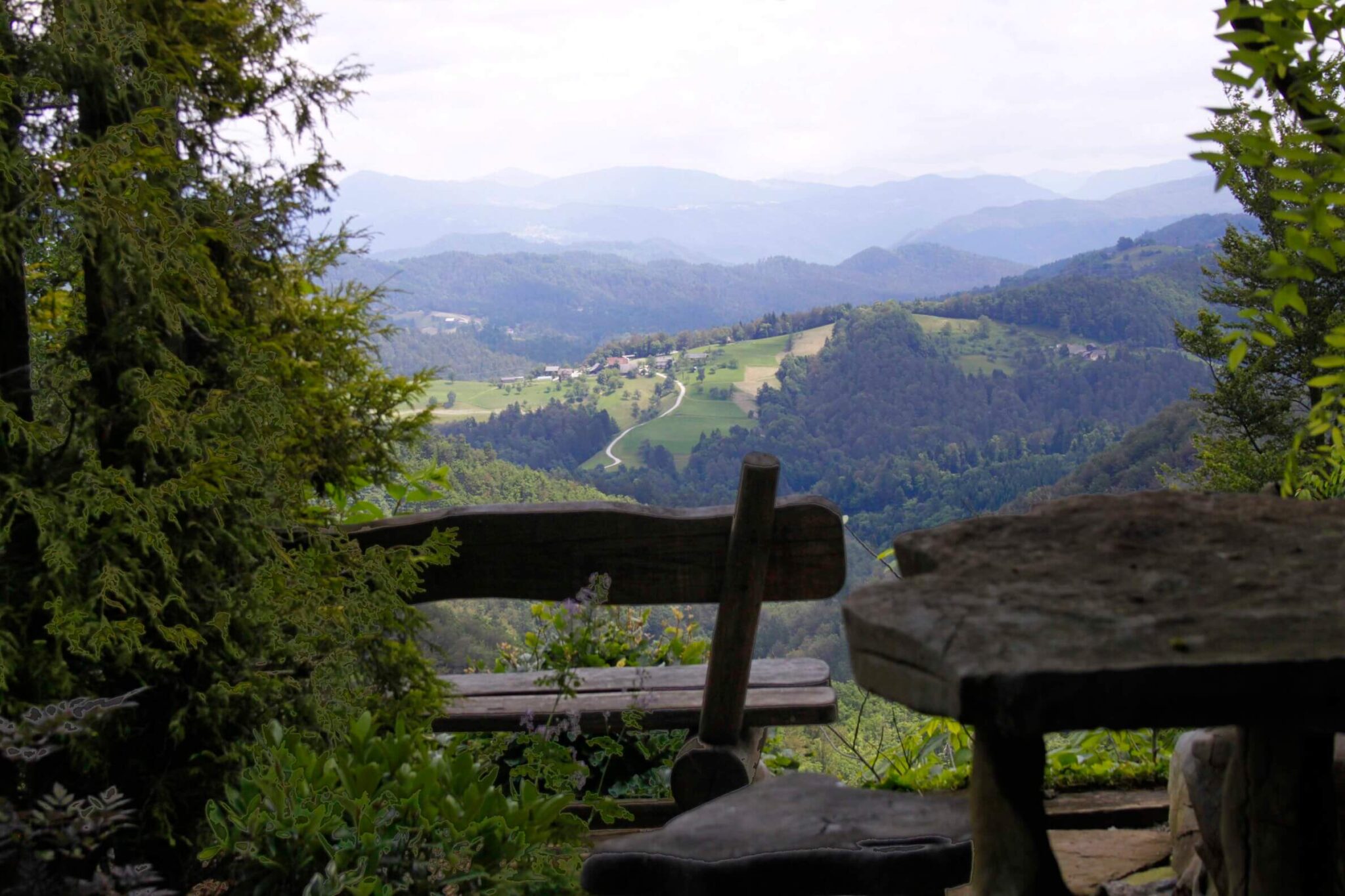 S klopce ob robu strmine, kjer se parcela spušča proti dolini, se na pravljično zasnovanem vrtu, ki smo vam ga delno že predstavili, ponuja izjemen razgled. »Tamle vidimo Kum, Čemšenik, Zasavsko Sveto goro. Pogled se odpira na vse strani in mislim, da prav ta širina ustvarja občutek miru in povezanosti z naravo,« razkriva Miha Suliman Grudzinski. Na kratko razloži, kako se je pred desetletji lotil stabilizacije strmine, ki zdaj gosti okrasne trave, ameriške slamnike, hoste v senci in maslenice. »Še kositi je bil problem na tej strmini, zato sem s pomočjo železniških pragov oblikoval terase. Če bi se danes lotil tega, bi naredil drugače, obvezno bi poskrbel za drenažo, da bi bilo vse skupaj bolj trajno.«