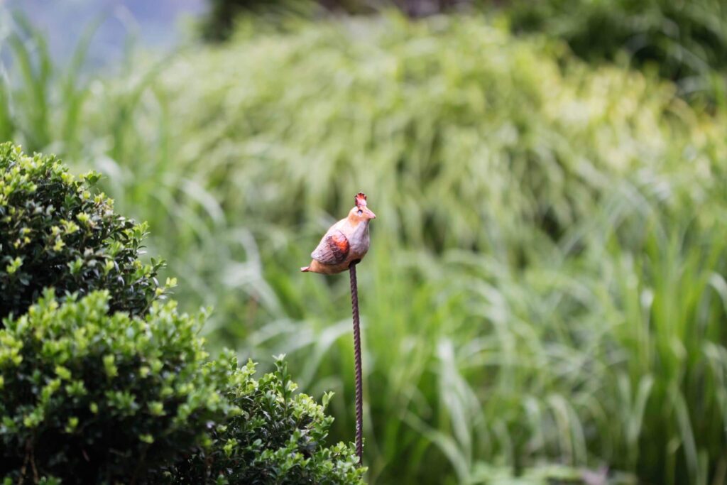 Med posebnostmi vrta so tudi pušpani. »Tamle je navadni pušpan, ki sem ga dobil pred 25 leti od prijateljice v Ljubljani. Rekla je: ‘Miha, vrži ga v gmajno,’ ker je bil grm bolan. Meni ga je bilo žal zavreči, pa sem ga posadil v nasad. Ko si je opomogel, sem ga začel oblikovati. Po 25 letih je postal tale lepotec. Režem ga v krožničke – to je zelo zahtevno, zelo počasi raste. Ampak je edinstven, takšnega ne vidiš nikjer. Zame ima neprecenljivo vrednost,« razlaga lastnik vrta.