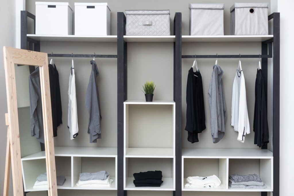 Garderobna soba razbremeni spalnico in kopalnico. Najprej izkoristite obstoječe shranjevalne površine, po potrebi pa jih dopolnite z omaro, stojalom za obešanje, taburejem za preoblačenje ali lepotilno mizico.