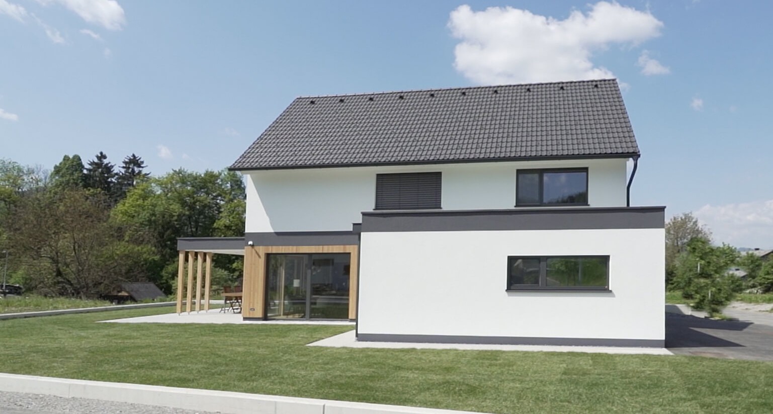Lastnika Mojca in Rok sta zemljišče kupila pred sedmimi leti. Kar nekaj časa je trajalo, da so bili urejeni vsi pogoji za gradnjo, in ker se jima je na koncu že zelo mudilo, da gresta iz najema na svoje, sta se odločila za leseno hišo, ki je postavljena hitreje kot zidana. »Pregledali smo več različnih načinov gradnje. Na koncu smo se odločili za lokalnega izvajalca iz Škofje Loke, ki je nudil gradnje v načinu CLT, se pravi iz križno lepljenega lesa. Naju je ta način gradnje prepričal, videli smo, da gre za masivno konstrukcijo, stene so debele deset centimetrov,« pove Rok in doda, da je od začetka gradnje do vselitve minilo le 10 mesecev.