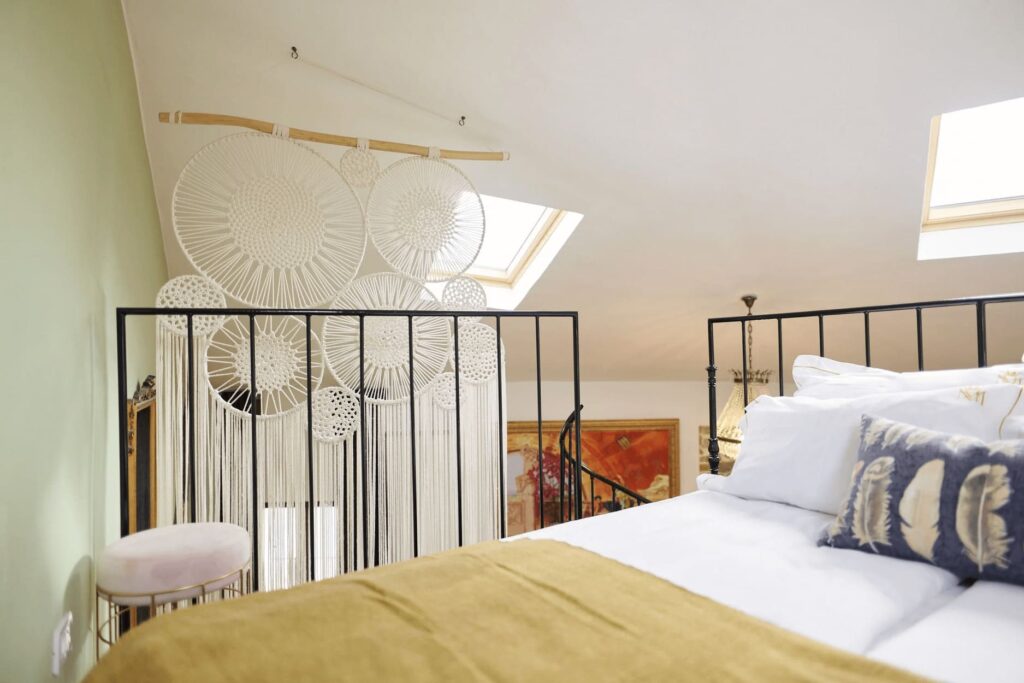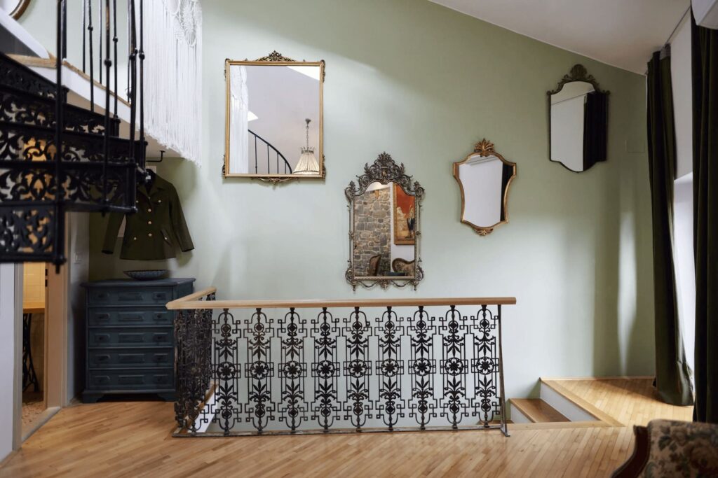 Pri drugi opremi so stavili na živahnost in barvitost. Stena, ob kateri se po stopnicah povzpnemo v stanovanje, je odeta v nežno pastelno zeleno barvo in polna ogledal, ki povečajo prostor. Ob spalni podest so obesili markanten makrame, ki ima dve vlogi: po eni strani je dekoracija, po drugi pa zastre pogled v globino stopnišča. Za konec so dodali še zlate nianse, ki zaokrožijo stanovanje v celoto in mu podarjajo tudi eleganco. »Zlato smo uporabljali v ogledalih, v priboru, zavesah, lučeh. V bistvu smo želeli presekati to staromodno nit in dodati nekaj novega,« sklene lastnik.