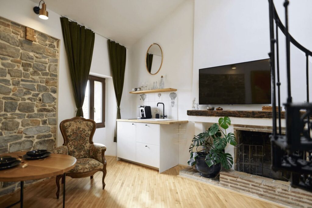 Posegov je bilo toliko, da jih je težko našteti. Na srečo je bila streha v dobrem stanju, narejene so bile medetažne plošče, od prejšnjega lastnika je ostala še ograja. Vse drugo je bilo treba izdelati na novo – stene, električno in vodovodno napeljavo, podest s posteljo. Veliko dela je bilo zlasti z izpostavljenim delom kamnite stene. Andrej je z nje stolkel omet in naletel na lep kamen, ki naj bi bil še iz časa gotike. Fuge je naredil po vzoru venecijanskega ometa. »To je ena takšna posebna tehnika, kjer se mešajo kalcit, apneno apno in kremenčev pesek. Nastane niansa, ki se zelo približa originalnemu stanju fuge,« pojasnjuje.