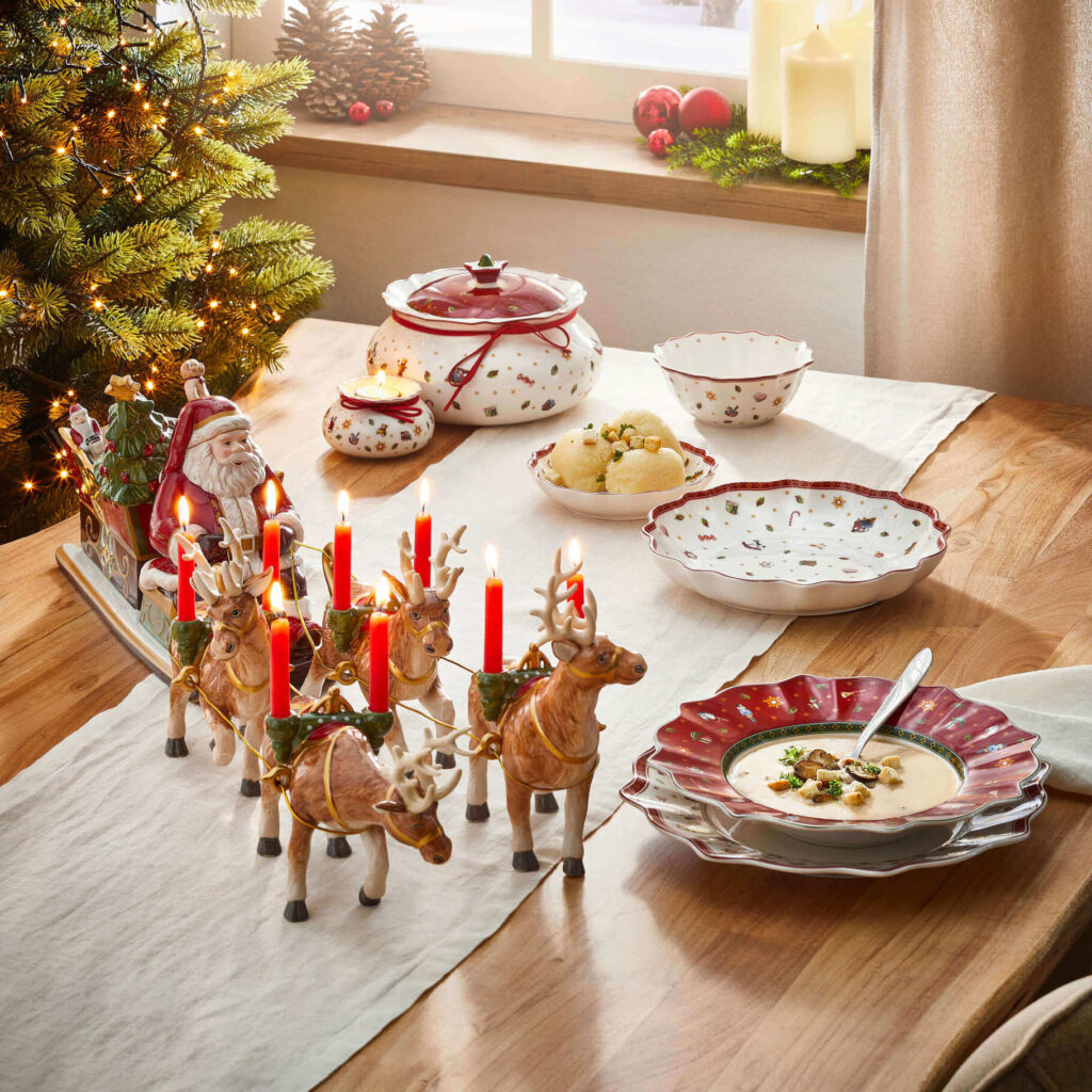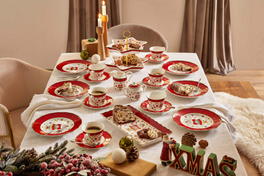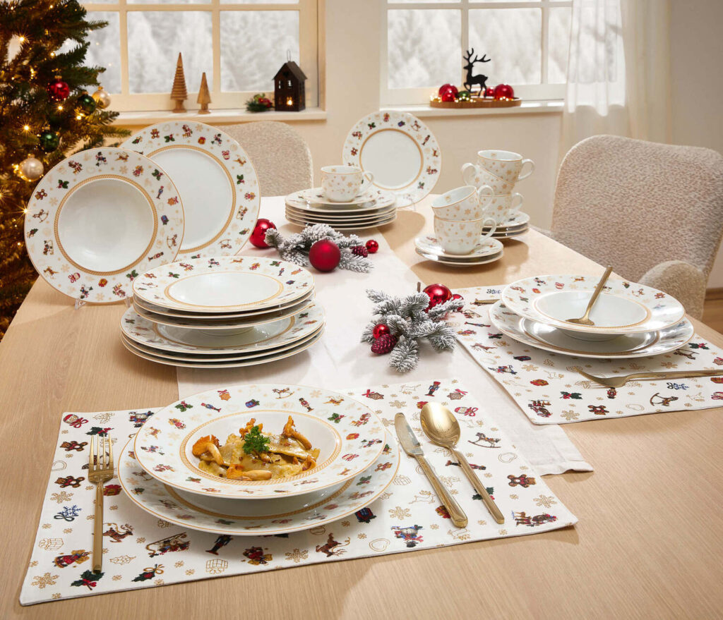 Pri ustvarjanju prazničnih pogrinjkov ima ključno vlogo pravi servis. Božični porcelan Villeroy & Boch slovi po vrhunski kakovosti, evropski tradiciji in prepoznavnih motivih: božičnih vasicah, jelenčkih, snežinkah in klasičnih rdeče-zelenih barvnih kombinacijah. Ti servisi so brezčasni, primerni za zbiratelje in ustvarjajo občutek magičnega decembrskega razkošja.