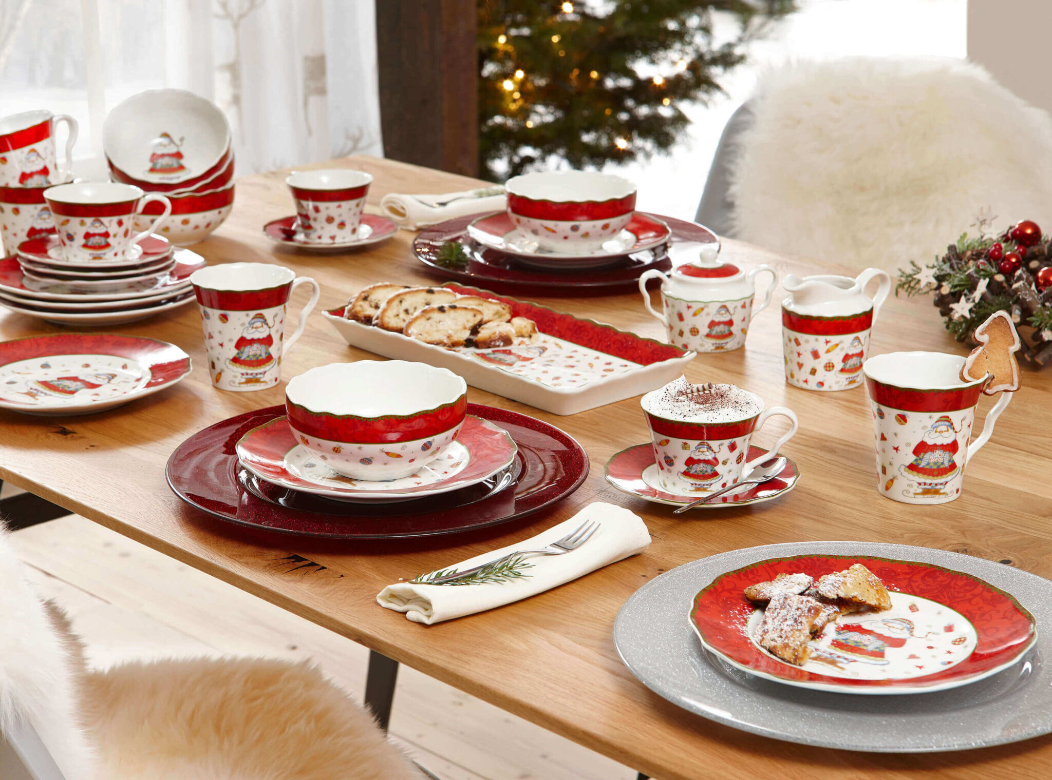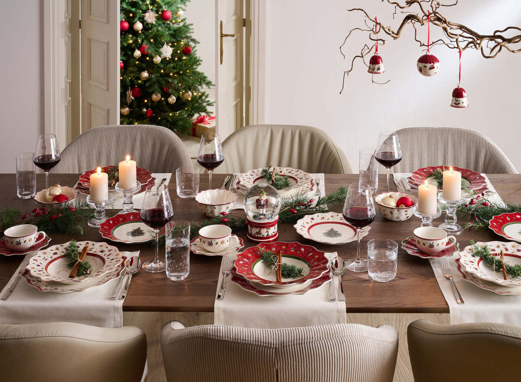 Pri ustvarjanju prazničnih pogrinjkov ima ključno vlogo pravi servis. Božični porcelan Villeroy & Boch slovi po vrhunski kakovosti, evropski tradiciji in prepoznavnih motivih: božičnih vasicah, jelenčkih, snežinkah in klasičnih rdeče-zelenih barvnih kombinacijah. Ti servisi so brezčasni, primerni za zbiratelje in ustvarjajo občutek magičnega decembrskega razkošja.