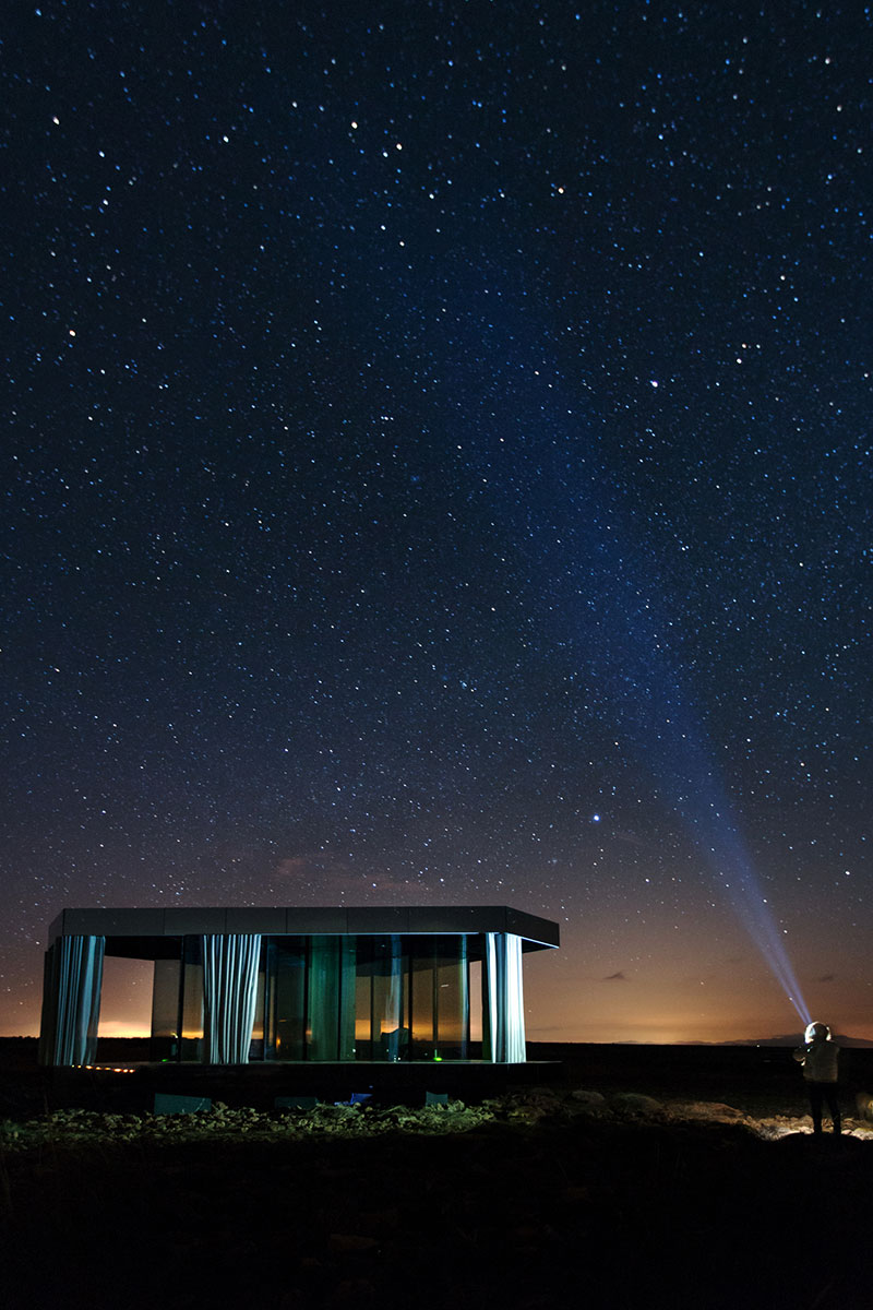 OFIS arhitekti so zasnovali razgiban montažni objekt, ki ga sestavljata dve leseni sendvič plošči – tla in streha -, okrog in okrog pa ga objema steklo. Znotraj najdemo spalnico, dnevni prostor in kopalnico, vsi prostori pa se odpirajo na verando, pokrito in zasenčeno, ki je podaljšek bivalnega prostora, hkrati pa ustvarja zaščito pred soncem in vetrom. Ogledala, v katera je oblečen notranji strop in zunanji ovoj hiše, še poudarjajo njeno minimalno estetiko – zdi se namreč, kot da bi se hiša popolnoma stopila s svojo okolico. Hiša ima minimalni okoljski odtis in minimalno porabo energije: senčenje steklenih površin z zunanjimi zavesami zagotavlja udobno klimo v interierju, fotovoltaika na strehi pa poskrbi za pridobivanje lastne električne energije na odročni lokaciji.