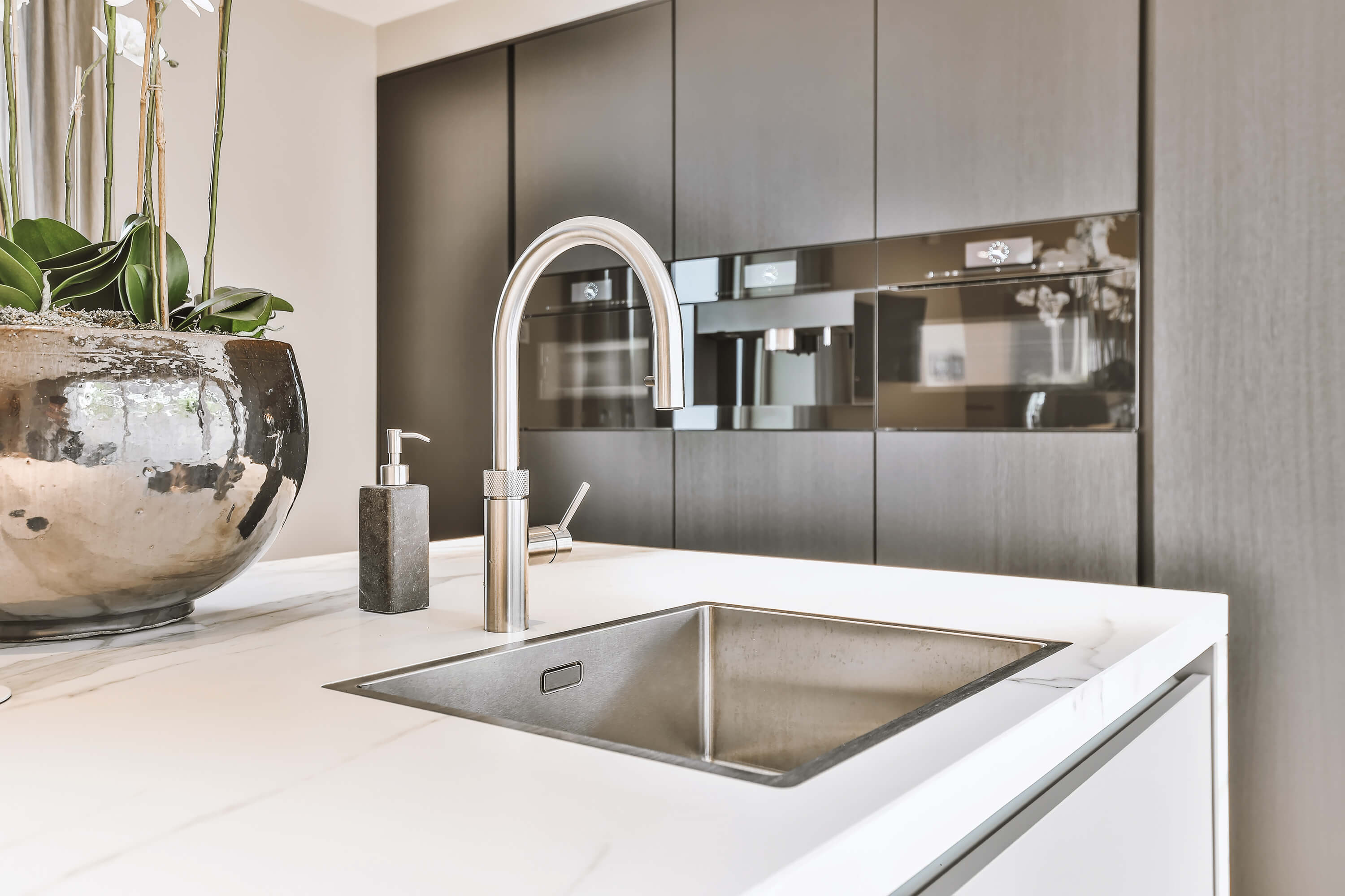 Črno-bela kuhinja je bila dolga leta sinonim za sodoben dom. A tako izrazit kontrast je lahko sčasoma naporen in prostoru doda hladen značaj. Poleg tega so na temnih površinah hitro vidni prstni odtisi in sledi uporabe. V praksi se bolje obnesejo mehkejši, toplejši toni – pesek, greige, umirjeni sivi ali zeleni odtenki – v kombinaciji z naravnimi materiali. Takšna kuhinja deluje bolj povezano, lažje se prilagaja spremembam in ostane prijetna tudi po več letih.