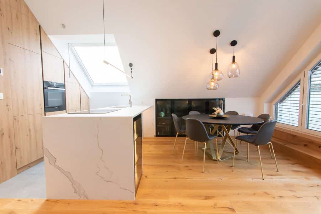 Petra in Matic sta v osnovi iskala stanovanje z atrijem ali teraso, kar bi jima omogočilo stik z naravo in svežim zrakom. Na koncu sta se navdušila nad podstrešnim stanovanjem, ki sta ga izpilila še s pomočjo arhitekta. Skupaj so poskrbeli predvsem za eno ključno stvar – z dobro načrtovanimi strešnimi okni so namreč v elegantni dom vnesli obilico dnevne svetlobe, ki nudi bivalno izkušnjo na višji ravni.