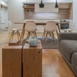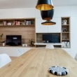 Kot kontrast belim monolitom nastopita lahka jedilna miza z elegantno osvetlitvijo in udoben kavč, ki s sestavljivo, skoraj skulpturalno kavno mizico iz masivnega lesa ustvarja prijeten kotiček za sproščanje, druženje in igro.