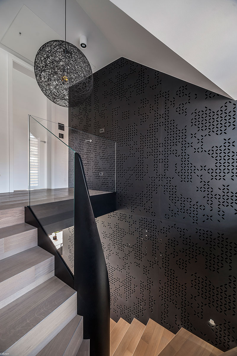 Prva je padla stena, ki je ločevala stopnišče od bivalnega prostora. Namesto nje so tja postavili perforirane plošče iz črnega mediapana, ki v unikatno zasnovanem vzrocu prepuščajo svetlobo in nakazujejo povezanost prostorov. Ta panelna stena je hipoma postala središče hiše: ločuje dnevni prostor od stopnišča, nas vizualno popelje v nadstropje, in tam za seboj skriva skrivni prehod v spalnico.