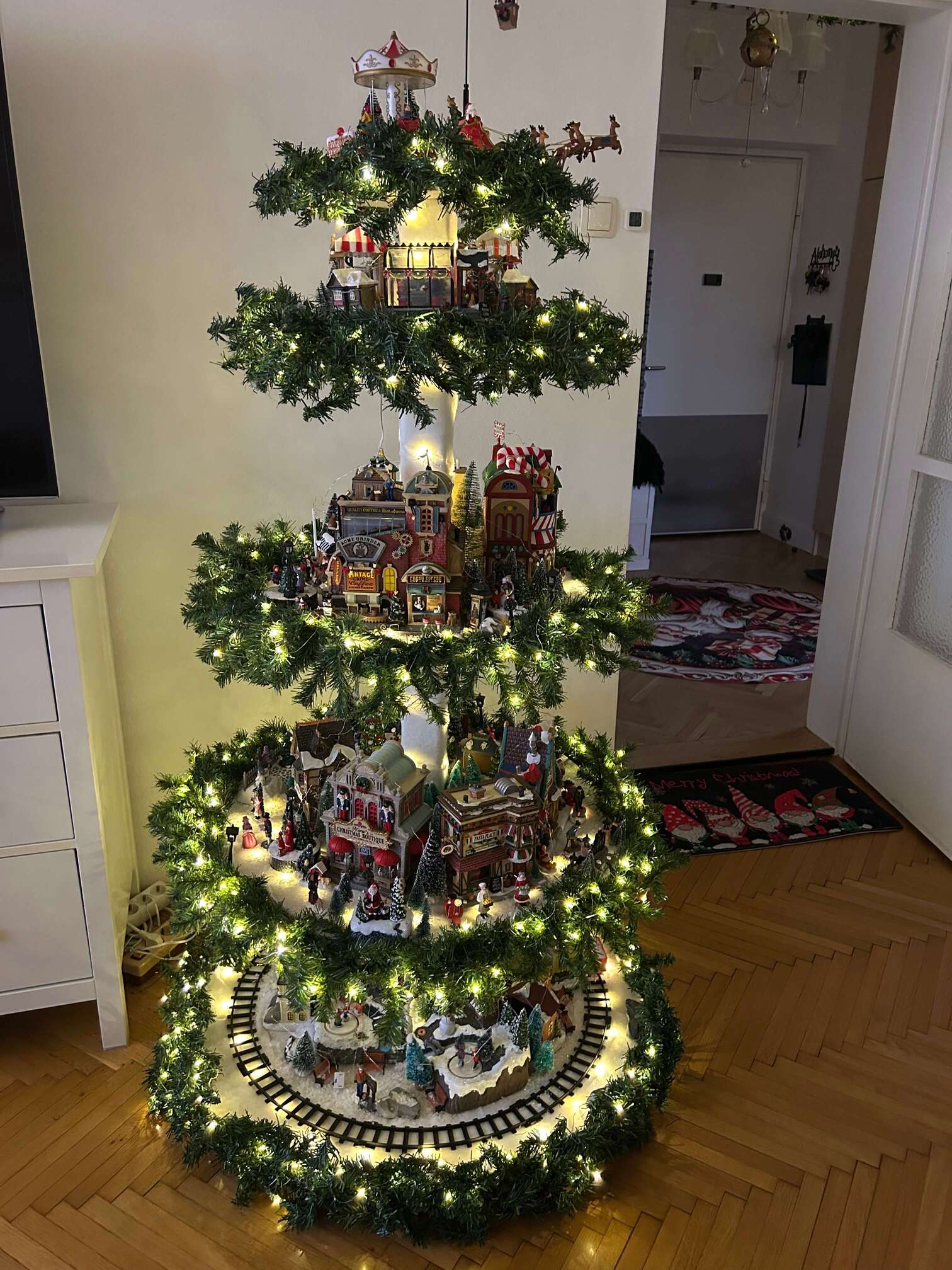 Med vsemi dekoracijami ima posebno mesto zbirka Lemax hišic, ki jih skrbno razporedi v tako imenovan Christmas village tree. Te hišice zanjo niso le dekoracija, temveč dragocen spomin in simbol topline. Poleg kupljenih okraskov ima doma še stare in nekaj ročno narejenih, ki dodajo čustveno vrednost prazničnemu vzdušju.
