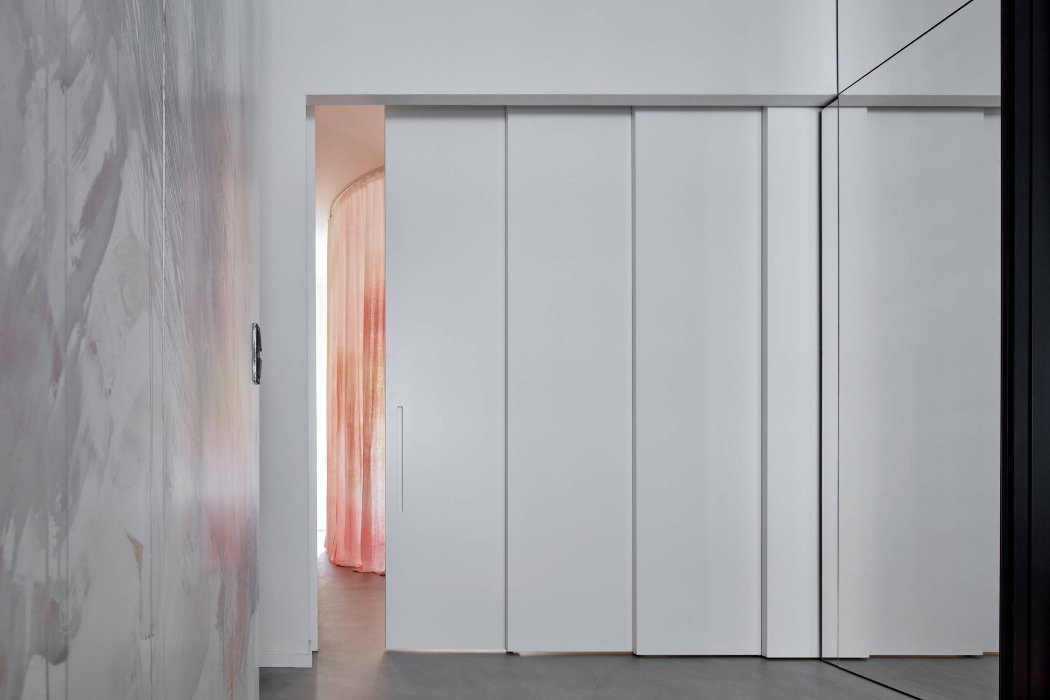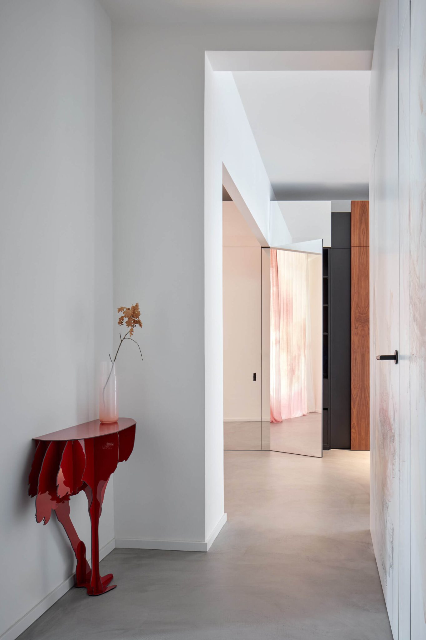 Lupina stanovanja odraža njegov prvotni duh, z belimi stenami pa prostor deluje skorajda galerijsko. Skozi prostor se pretaka le subtilen rožnati pridih, ki se postopoma preoblikuje in doseže vrhunec na obeh koncih stanovanja: v dnevni sobi z rožnato sedežno garnituro in v spalnici v kombinaciji z odtenki marelice in živahne škrlatne, ki se pojavljajo na zavesah ustvarjalke Linde Kaplanove.