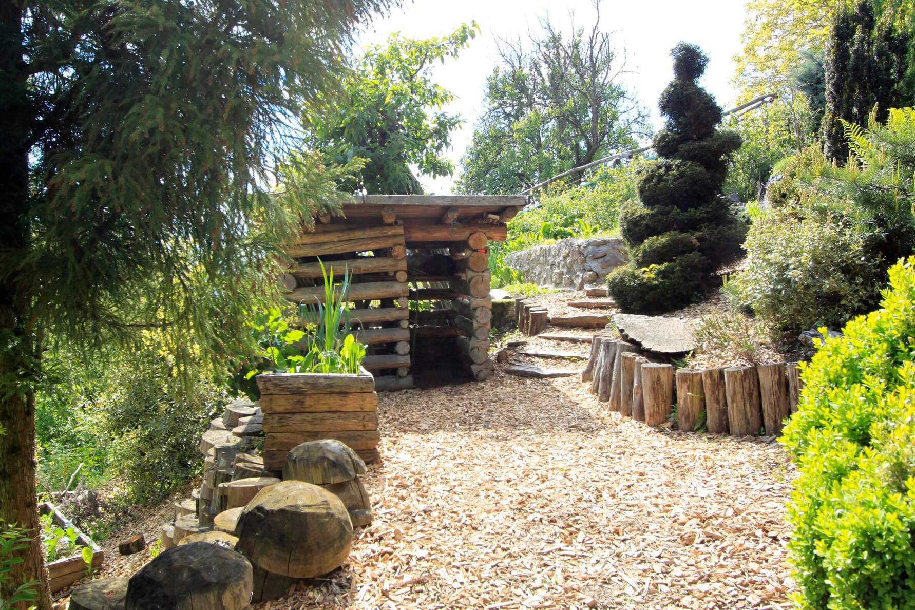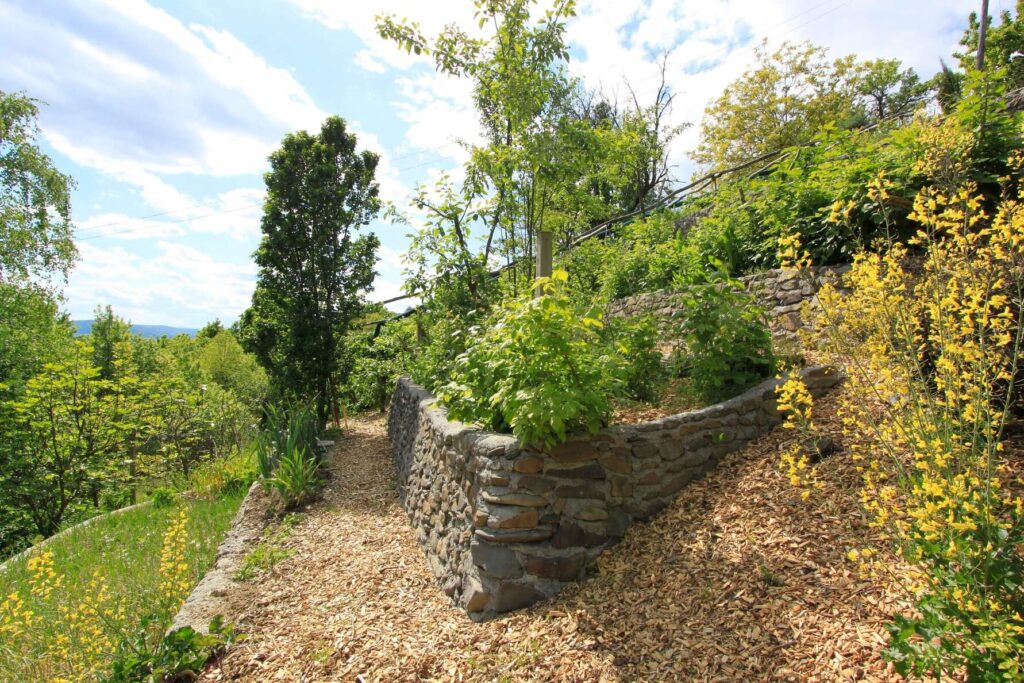 Višinska razlika 35 metrov je premostena s potkami, stopničkami, tremi ribniki in potočkom, kjer sekanci zadržujejo vlago in preprečujejo erozijo, hkrati pa služijo kot naravni radiator v sadovnjaku proti spomladanski pozebi. Del parka je namenjen zeliščem in zelenjavnemu vrtu za samooskrbo družine, kjer rastejo tudi stare sorte sadnega drevja. Ob sprehodu skozi park se ponuja tudi pogled na trajne nasade kaktusov, agav in juk.