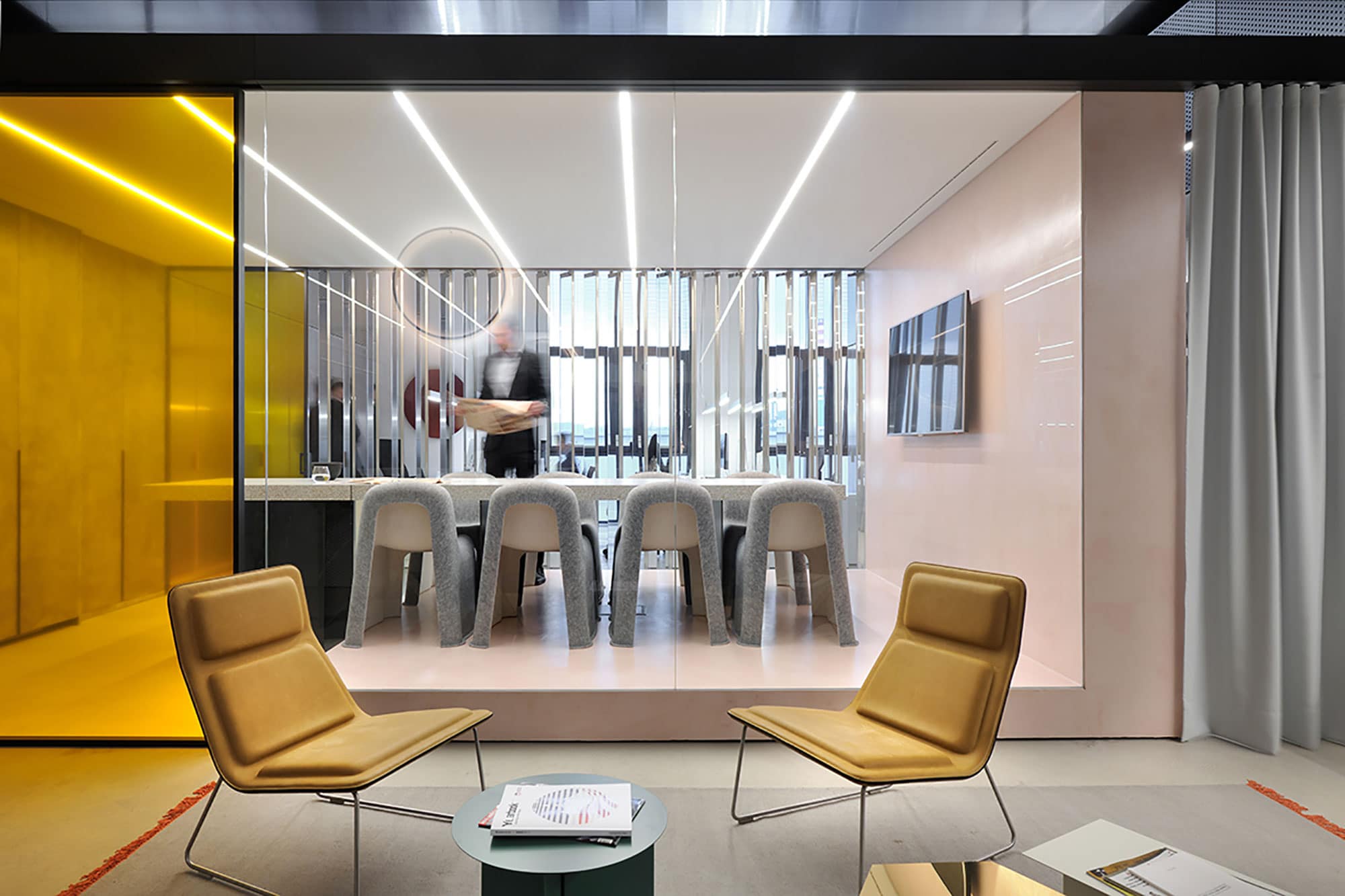 Naslednji sklop je osrednja, steklena sejna soba, skozi katero proseva svetloba vse do najglobljega kotička pisarne. Ta kubus je večino dneva odprt in v tem času služi kot prostor za »coffee point«, kjer si kavo lahko zaposleni pripravijo v vgradni čajni kuhinji. Ko se rumena vrata zapro, pa se prostor preobrazi v sejno sobo. Nenavadni, a udobni, v filc oblečeni stoli zagotavljajo, da smo prišli v podjetje, kjer gresta čut za ljudi in želja po iskanju kreativnih rešitev z roko v roki. Zasebnost sestankov v sejni sobi so arhitekti zagotovili z »zaveso« iz panelov, oblečenih v ogledala. Sejna soba tako – kljub temu, da je pogled na horizont zastrt – deluje velika in zračna.
