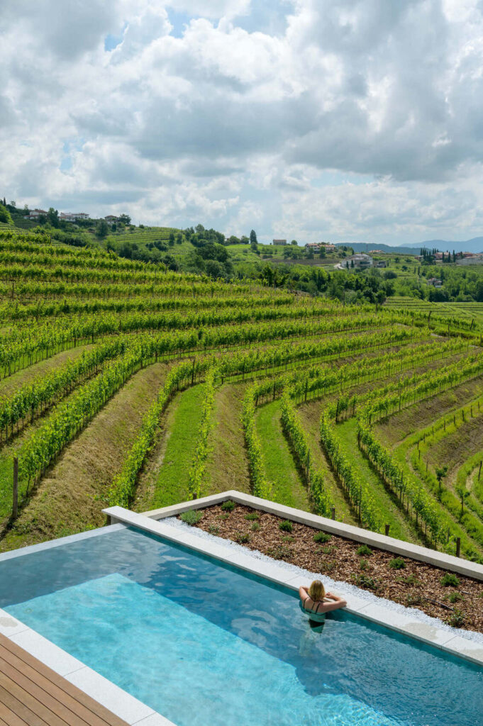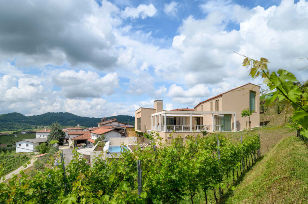 Vinska klet s spremljevalnim programom v Plešivu, v objemu Goriških brd, spretno združuje tradicionalni in sodobni arhitekturni jezik ter se organsko zlije s terasasto pokrajino v mehkem spustu proti dolini. Projekt, delo biroja Kombinat arhitekti, je tudi prejemnik prestižne nagrade BIG SEE Architecture Award za leto 2025.