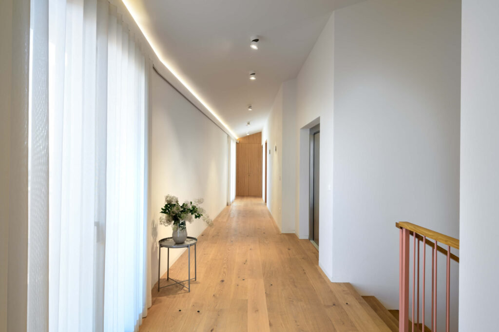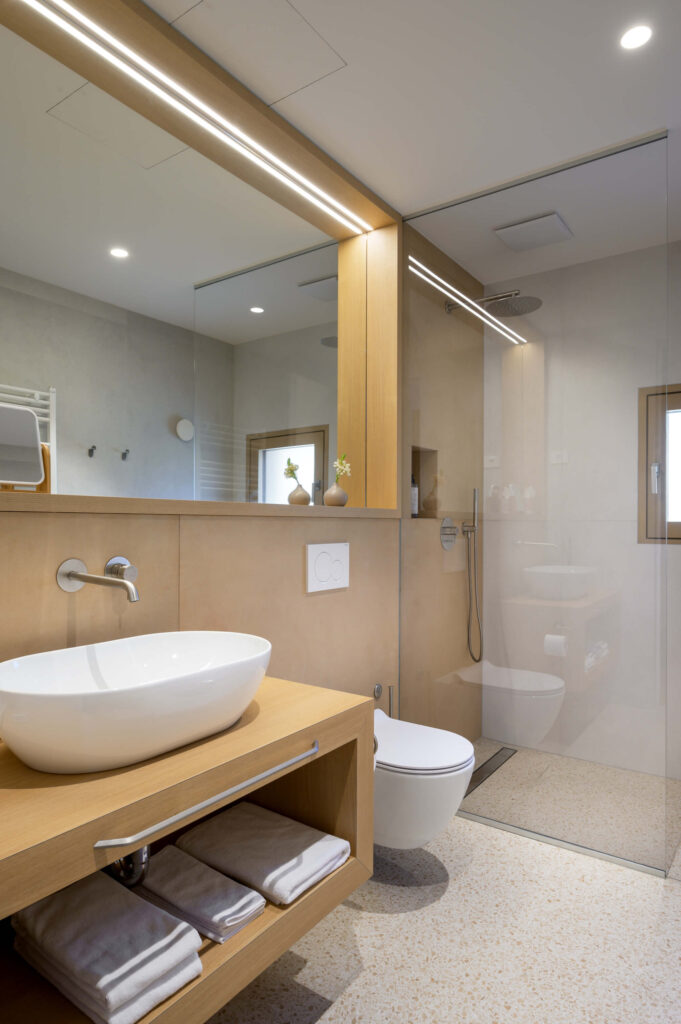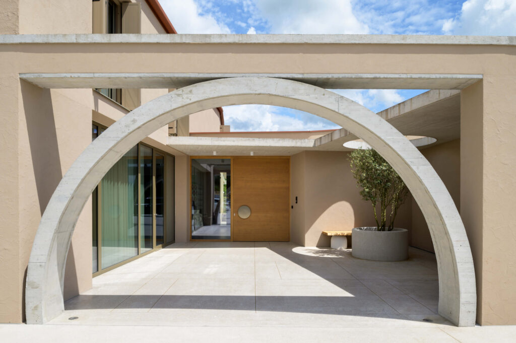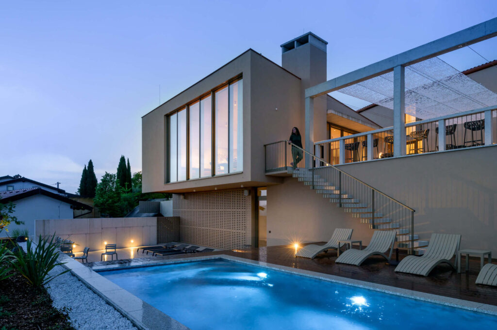 Zasnova temelji na subtilnem prepletu notranjih in zunanjih prostorov – prostori niso le zaprti, ampak so zunanji prostori zasnovani kot skoraj enakovredni bivalni volumni. Terase, dvorišča in odprti prostori se odzivajo na naklon terena in mikroklimatske pogoje: senčenje poleti, sončenje spomladi, zaščita pred vetrom v hladnejših mesecih.