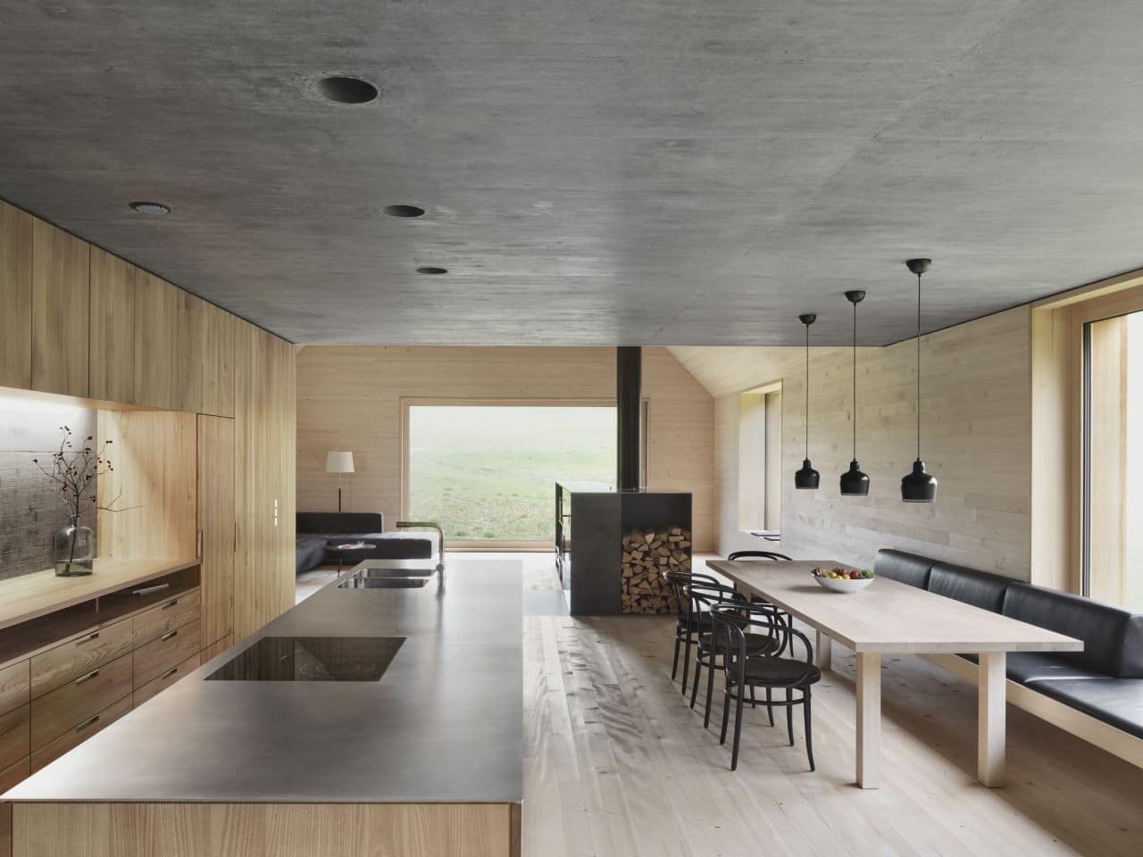 V avstrijskem studiu Bernardo Bader Architekten so pred izdelavo hiše natančno preračunali količino lesa, potrebnega za izdelavo hiše. Tako so s posekom šestdesetih dreves (lokalnih smrek, jelk in brestov) pridobili točno količino lesa in zmanjšali količino odpadkov v proizvodnem procesu. Iz lesa so izdelani predelne stene, vrata, stenske, fasadne in talne obloge, pa tudi nekaj kosov pohištva. Osnovna, betonska konstrukcija hiše je mestoma neobdelana, s čimer so arhitekti uravnotežili pretežno svetel, lesen interier.