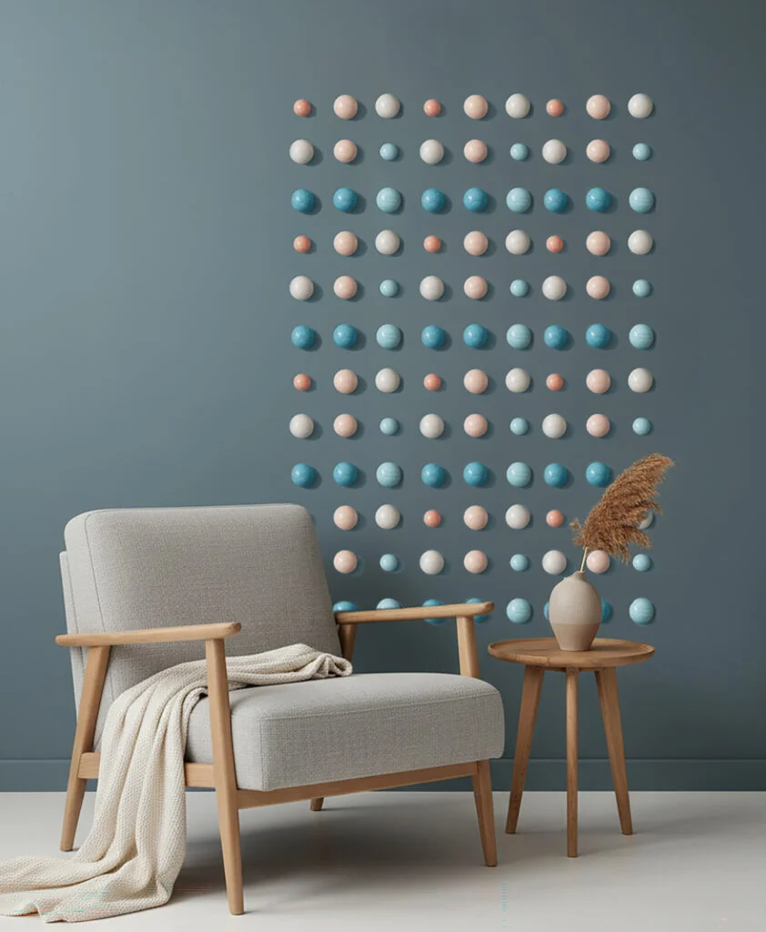 Krogla je primer oblikovalskega predmeta, ki nagovarja aktualna vprašanja v arhitekturi in oblikovanju – ročno delo in majhne serije kot protiutež globalni uniformiranosti. Sestavljena je iz ročno ulitih porcelanskih enot okrogle oblike, prekritih z unikatno glazuro. Tridimenzionalnost ustvarja globino in igro svetlobe, modularna zasnova pa omogoča raznolike postavitve. Trajnostna izdelava spodbuja premišljen, dolgoročen odnos do prostora in predmetov.