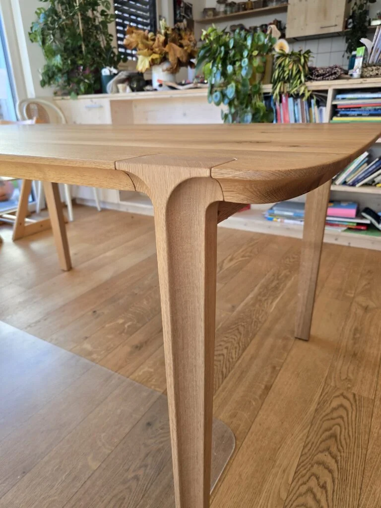 Vsi kosi Jana Miheliča so izdelani iz izključno masivnega lesa. Na sejmu je predstavili nov model mize iz kolekcije Peró, v celoti izdelane iz masivnega hrasta. Družbo pa mu je delal zares poseben kos pohištva, in sicer elegantno mačje gnezdo Koya.