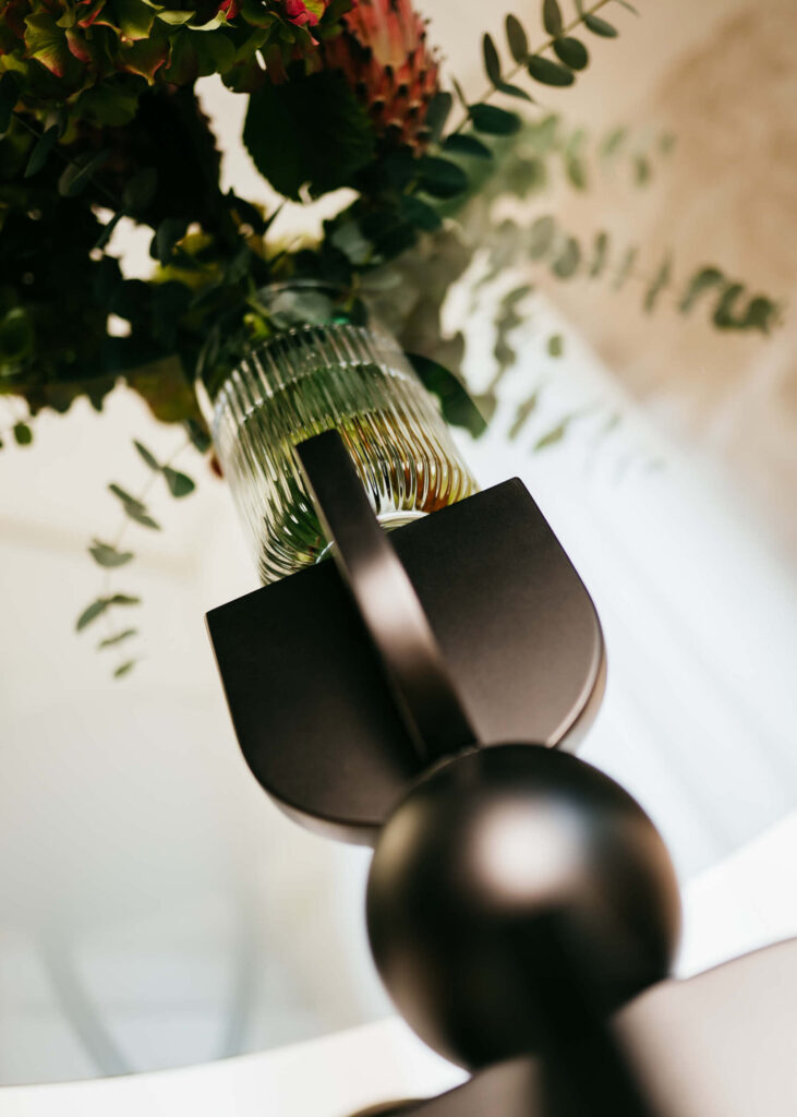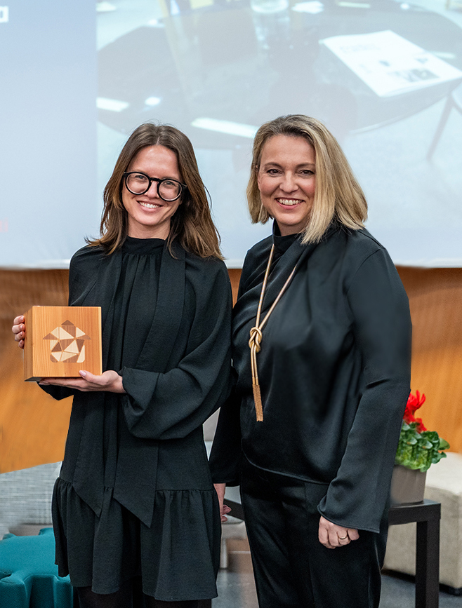 Sara Kresal, ustanoviteljica Studia Kresal, je na razstavi Top ideje predstavila mizico Ballerina – izdelek, ki v stiku stekla in lesa združuje eleganco, lahkotnost in močan čut za obliko. Zgornja mizna plošča iz parsol sivega stekla deluje zračno, medtem ko leseno, črno barvano podnožje s svojimi zaobljenimi linijami ustvarja uravnotežen kontrast. Njena oblika izraža gibanje in harmonijo, kot balerina v trenutku popolnega ravnotežja – je stabilna, a hkrati lahkotna v prostoru.