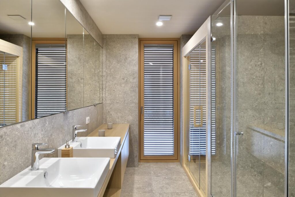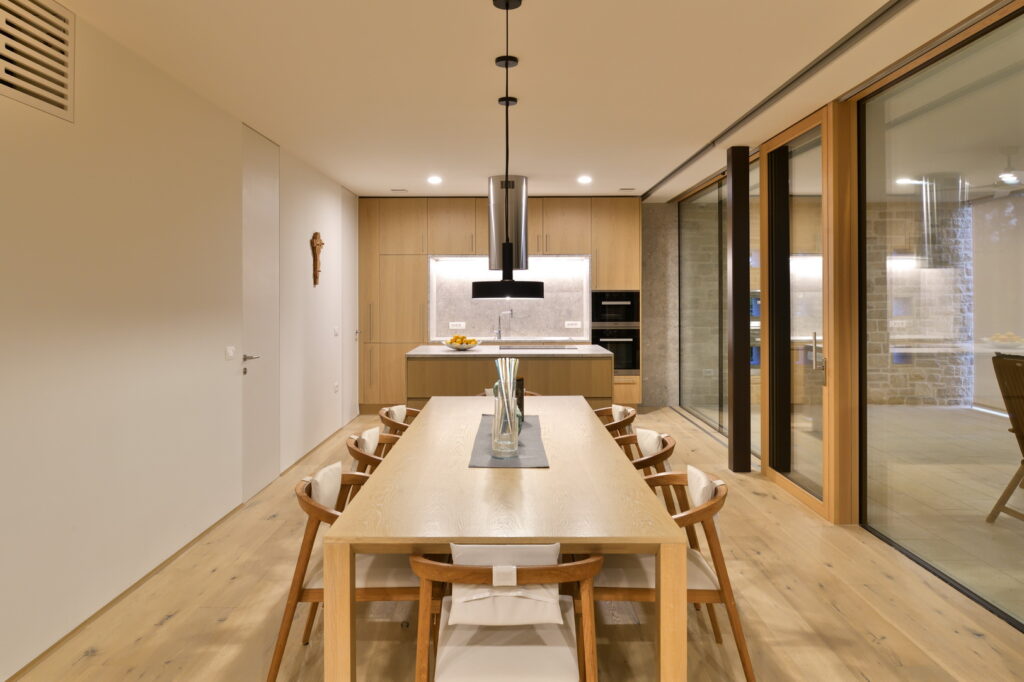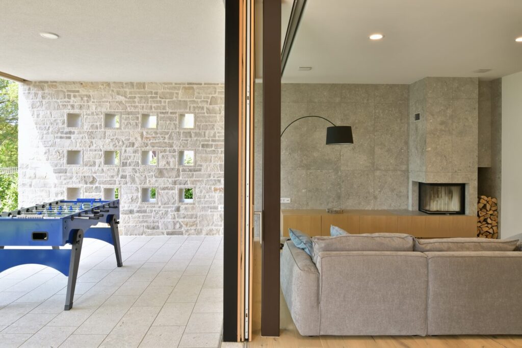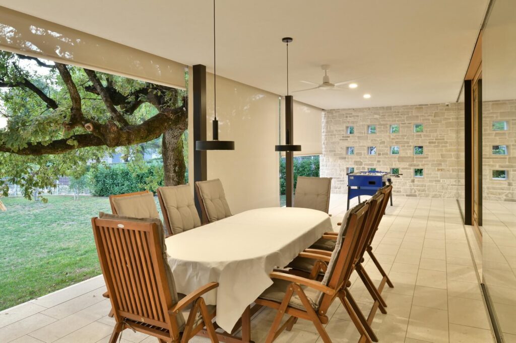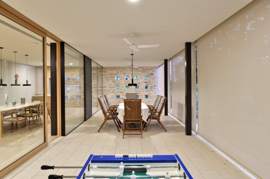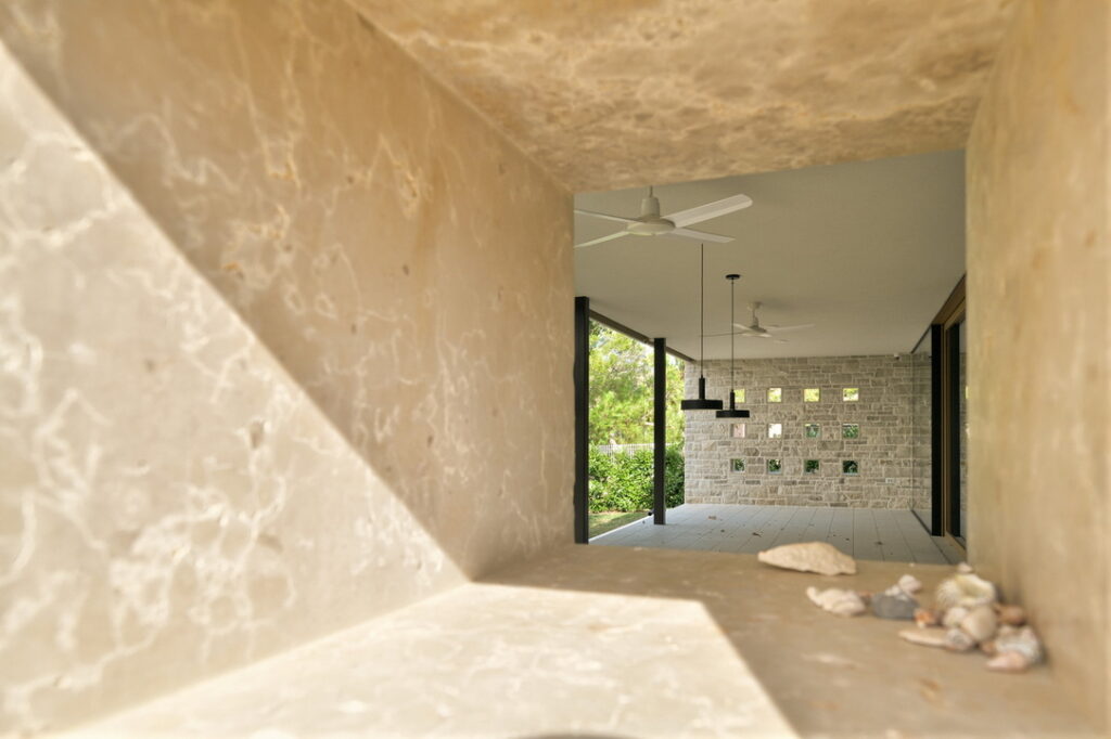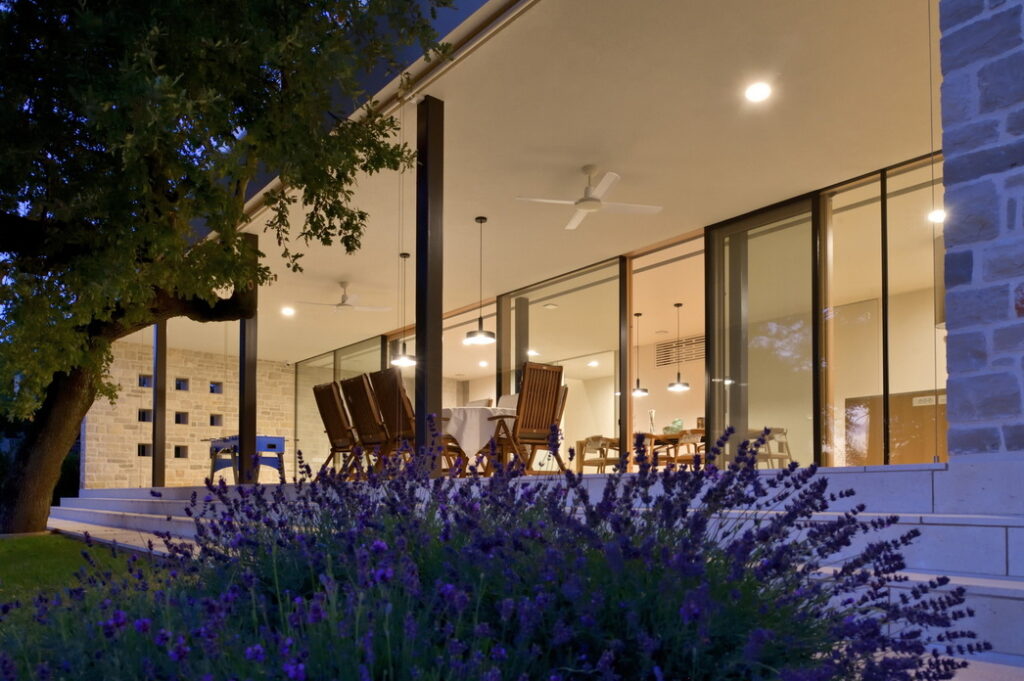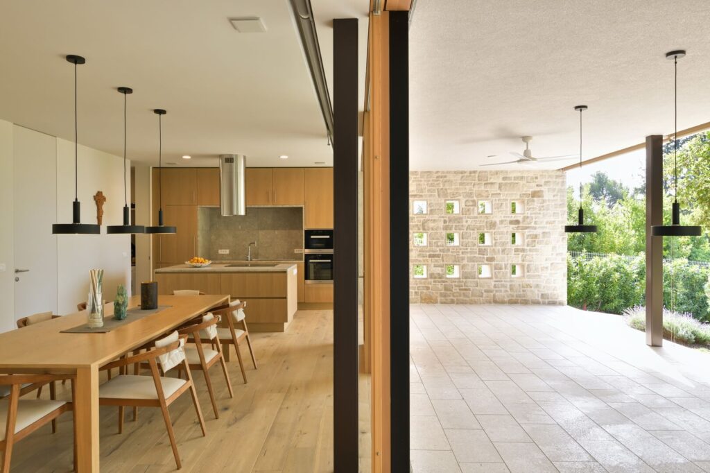 Senčenje je rešeno večplastno in subtilno. Spalni prostori so zaščiteni z lesenimi drsnimi polkni, medtem ko pritlični dnevni prostor senčita dve plasti – zunanja kamnita in notranja, mehkejša, s peščenimi screeni. Prav to plastenje briše mejo med notranjim, polzunanjim in zunanjim prostorom ter hiši podarja globino, ki se naravno nadaljuje navzven.