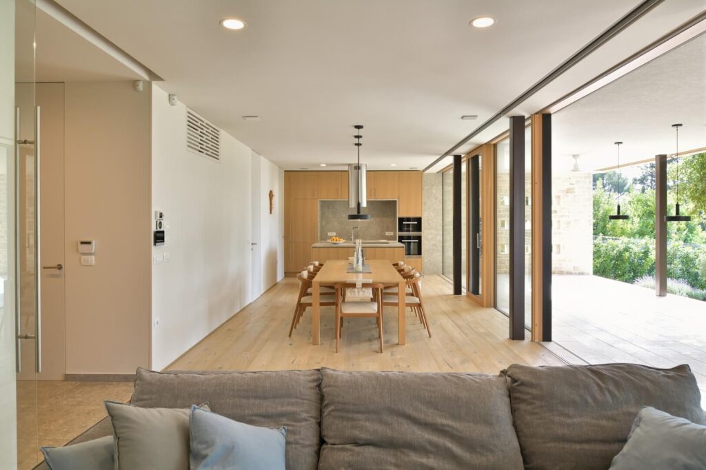 Tudi celotna zasnova hiše ostaja umirjena in pregledna. Enoten volumen se prilagaja le tam, kjer je to potrebno: pri vhodu se nekoliko umakne, da nastane nadkrit prostor za prihod, na zahodni strani pa se odpre v prostorno teraso, ki deluje kot naravno nadaljevanje dnevnega prostora.
