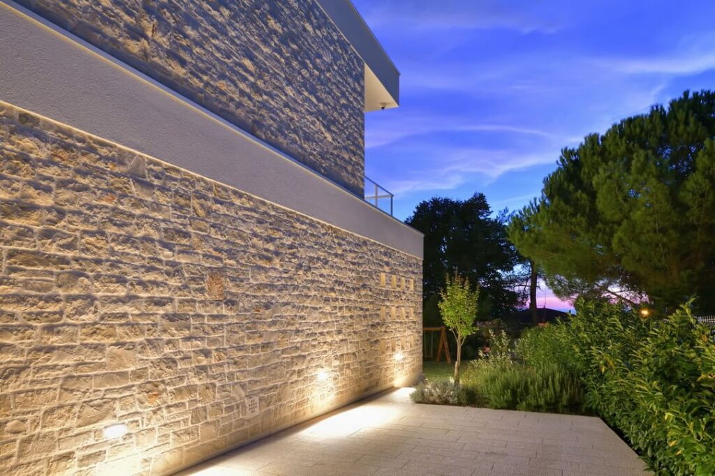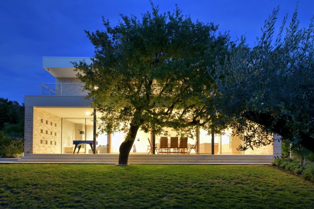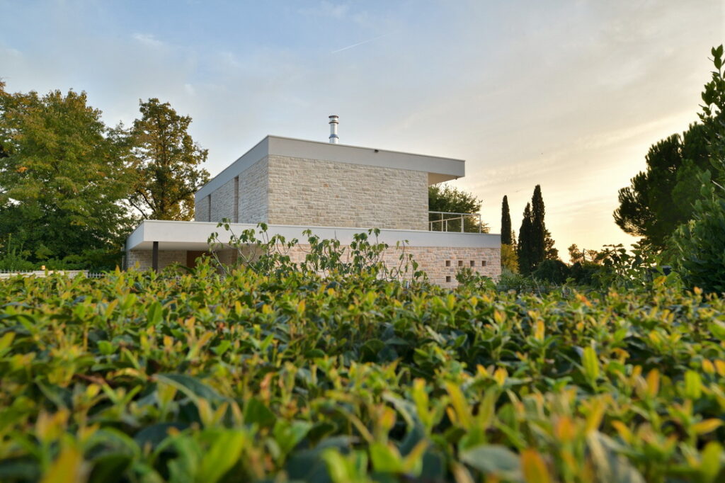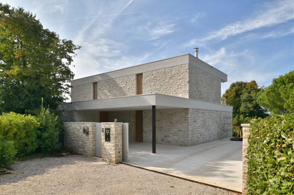 Konstrukcija objekta je klasična, a premišljena: armiranobetonski temelji, opečni nosilni zidovi in toplotna izolacija, zaključena z lokalnim istrskim kamnom kanfanar z območja Pazina, ki hišo trdno zasidra v prostor. Protiutež naravnemu kamnu je arhitekt dosegel z medetažnimi strešnimi ploskvami, ki se ponekod raztezajo čez celoten volumen in ščitijo terase, drugje pa zgolj rišejo robove in ustvarjajo senco.
