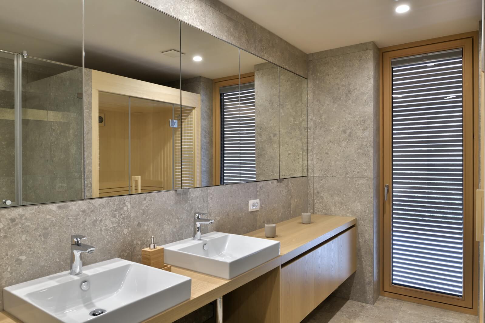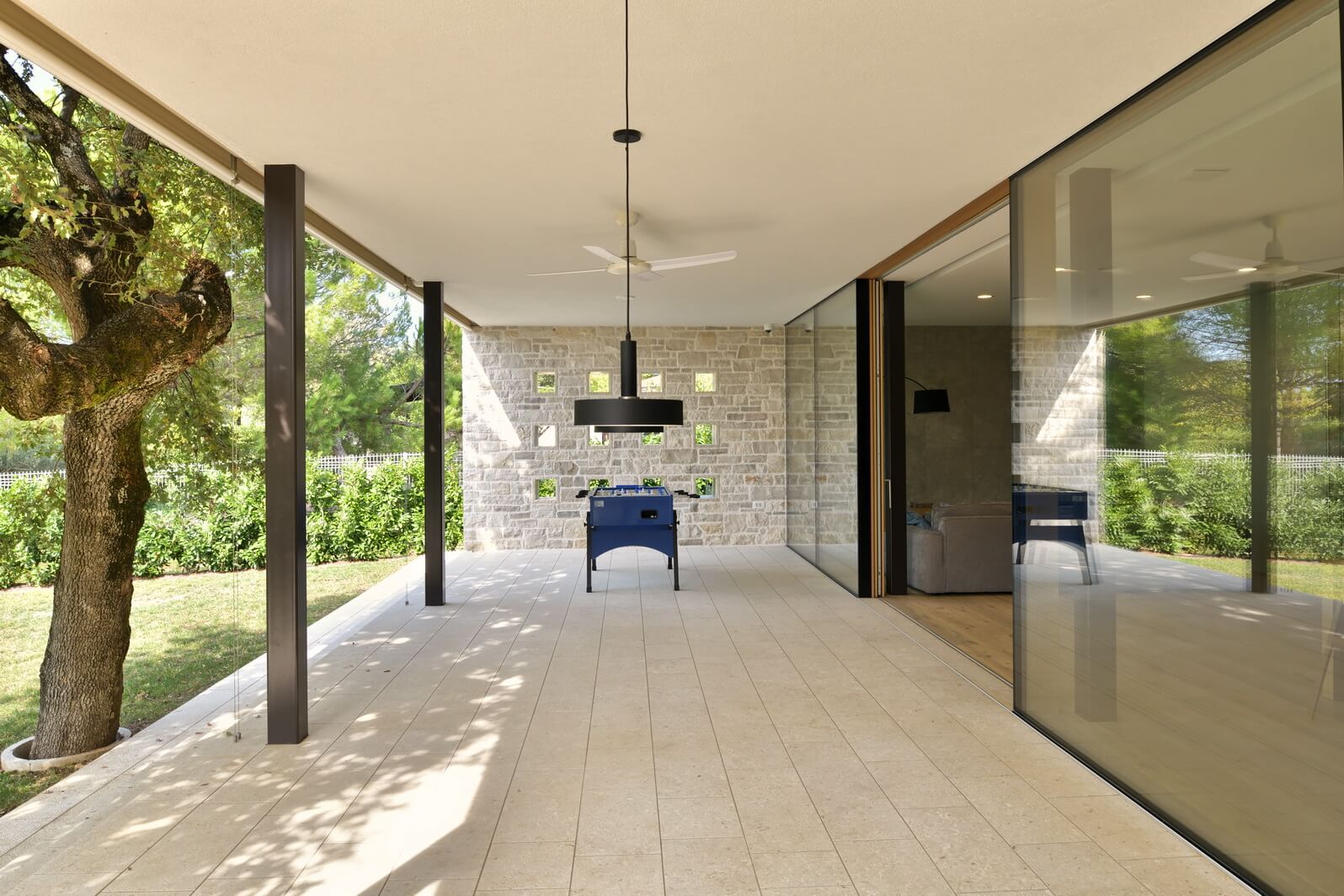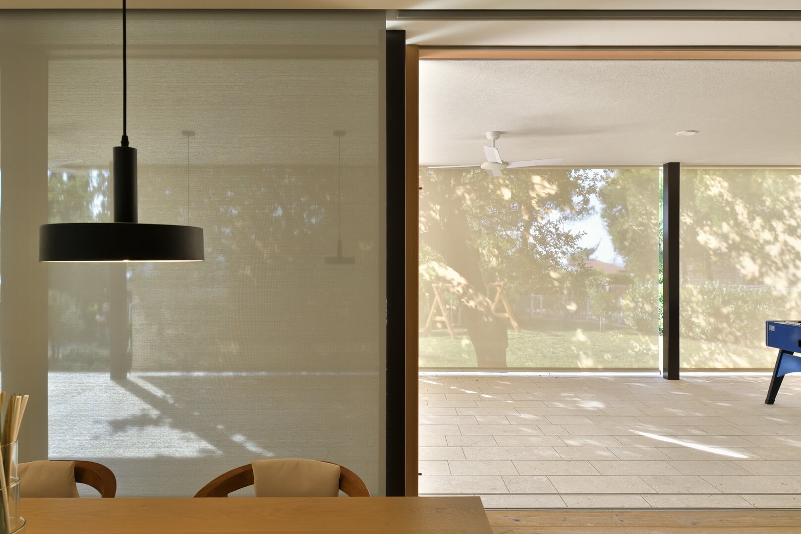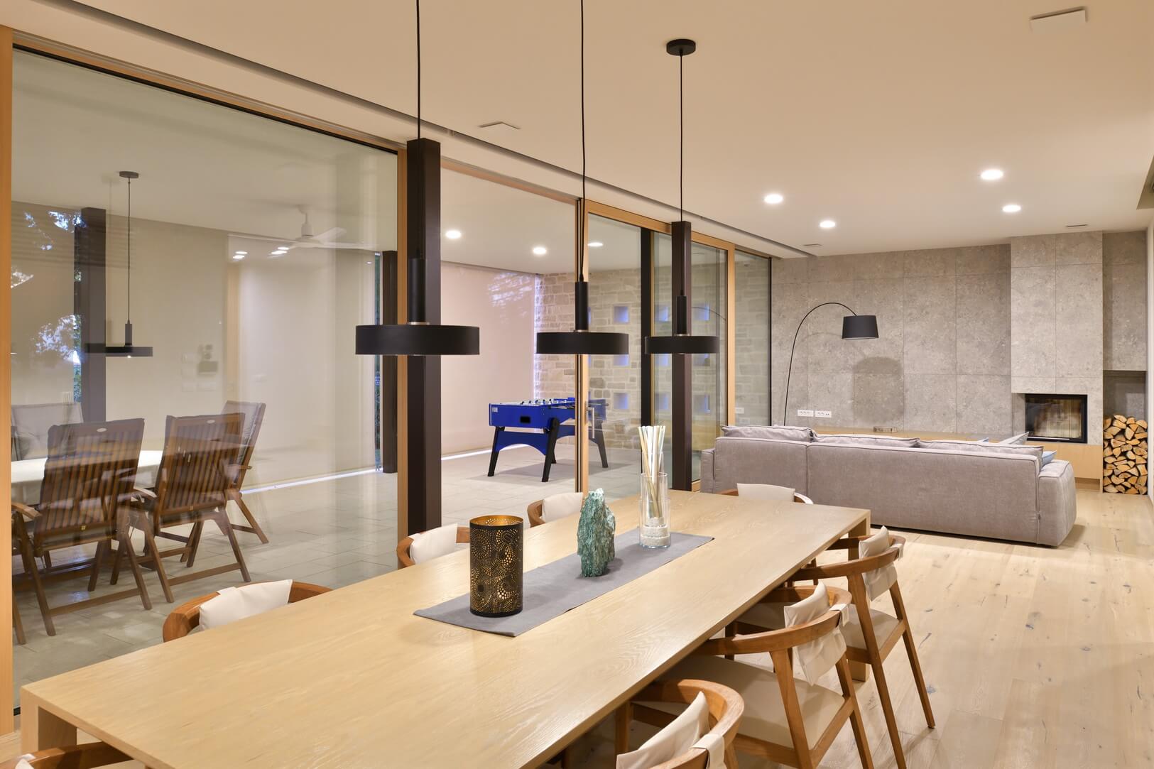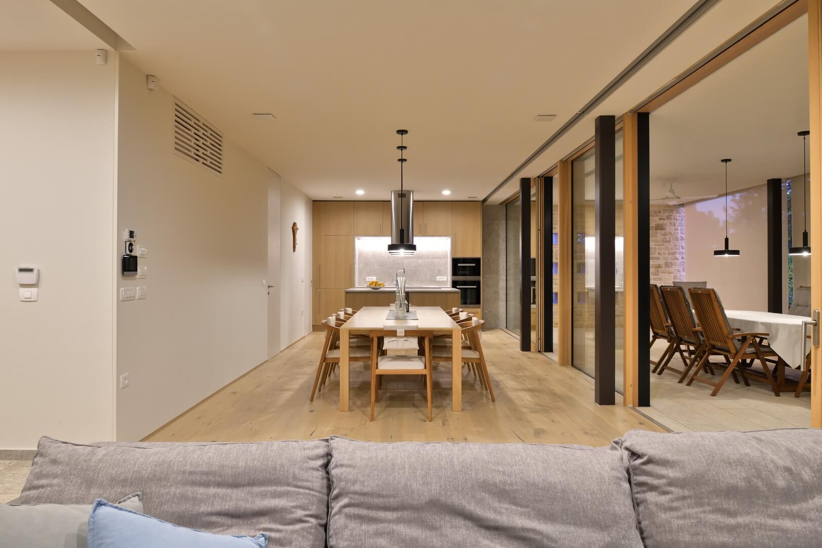Senčenje je rešeno večplastno in subtilno. Spalni prostori so zaščiteni z lesenimi drsnimi polkni, medtem ko pritlični dnevni prostor senčita dve plasti – zunanja kamnita in notranja, mehkejša, s peščenimi screeni. Prav to plastenje briše mejo med notranjim, polzunanjim in zunanjim prostorom ter hiši podarja globino, ki se naravno nadaljuje navzven.