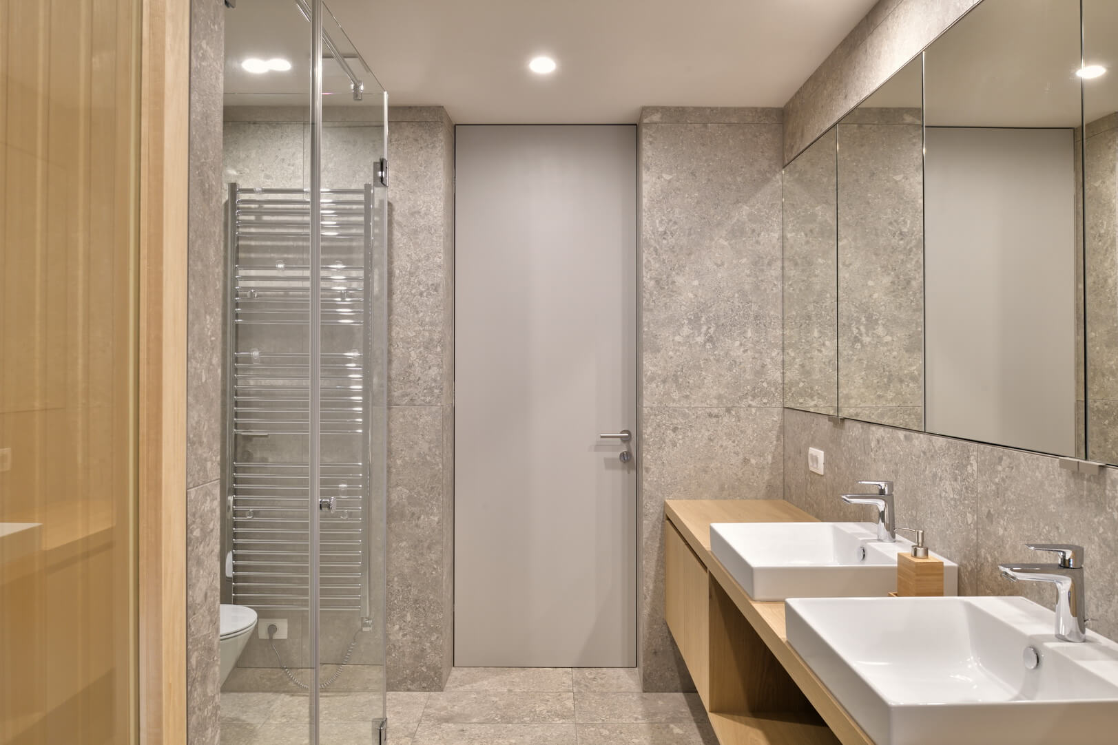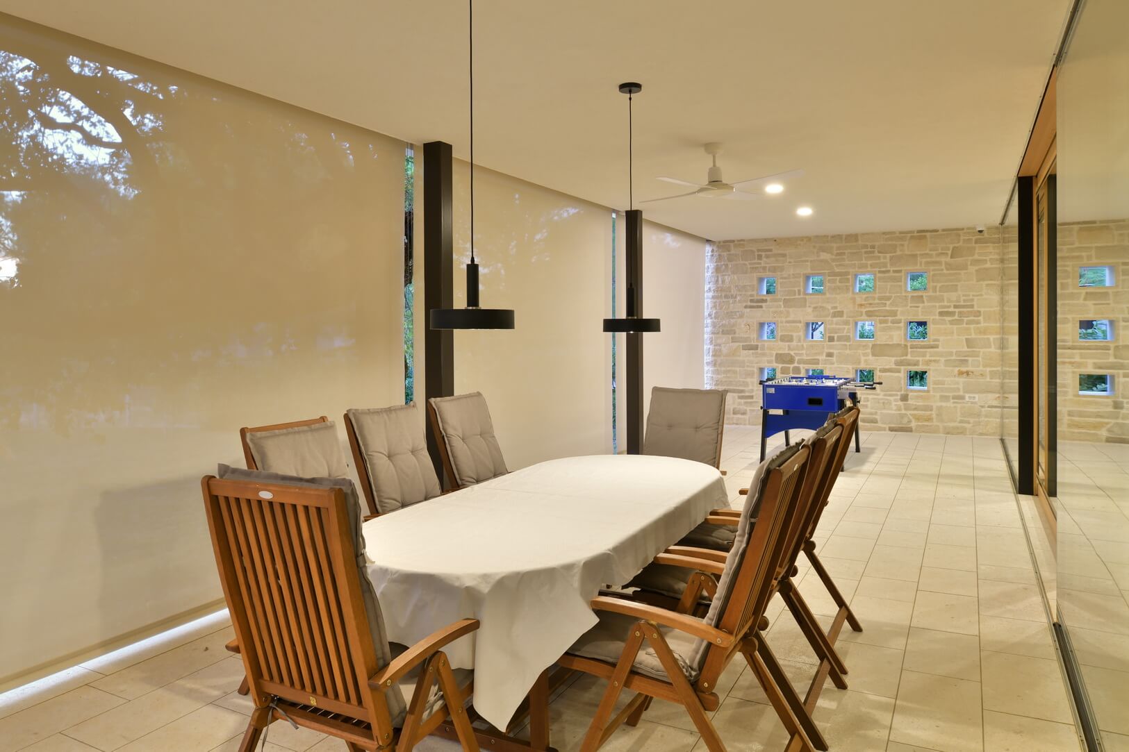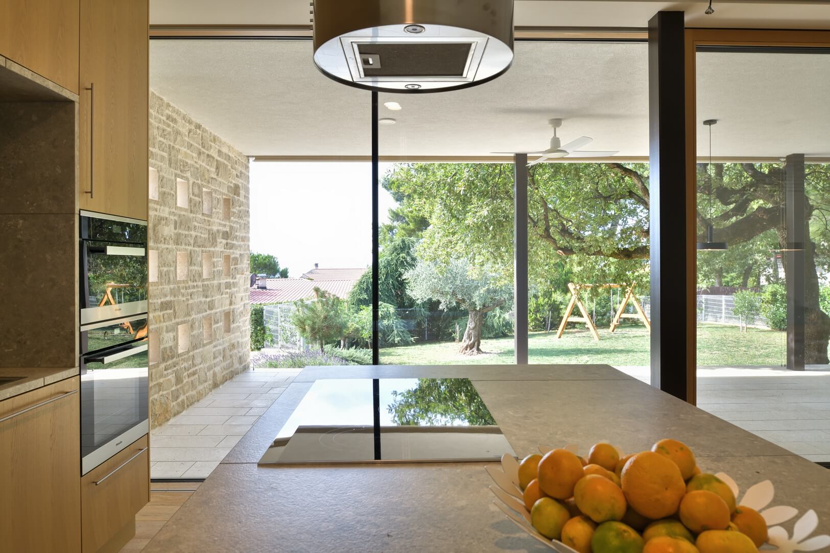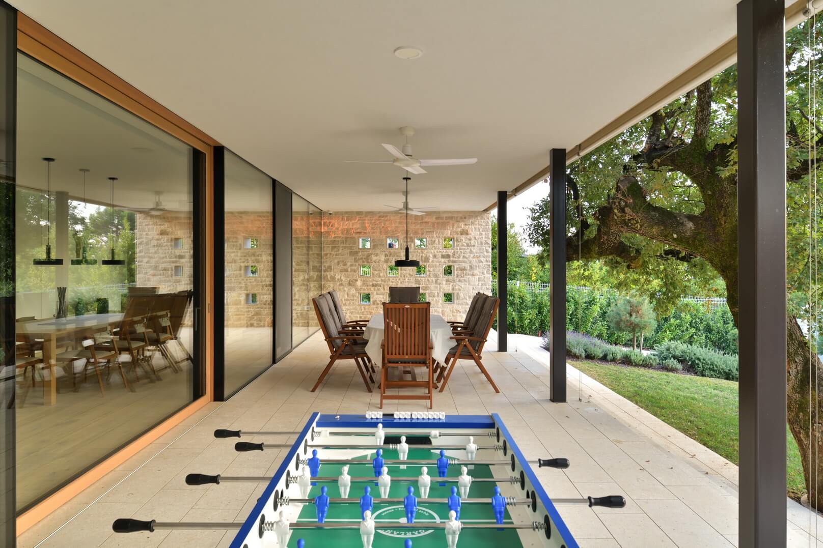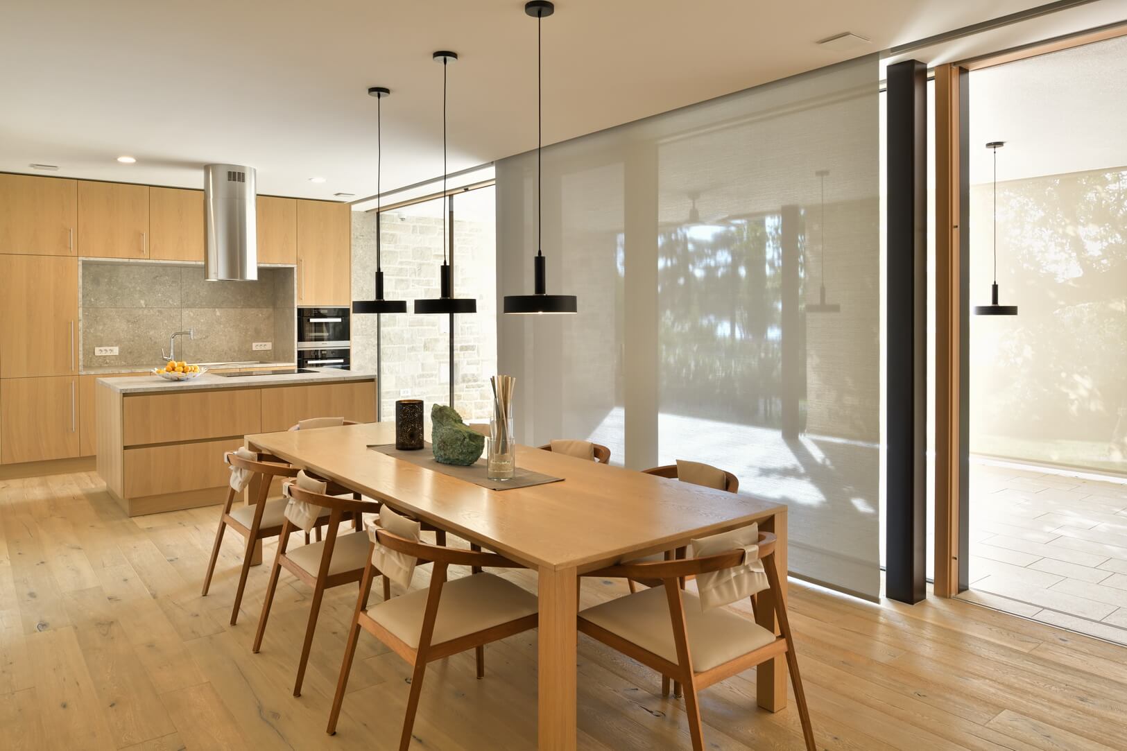 Senčenje je rešeno večplastno in subtilno. Spalni prostori so zaščiteni z lesenimi drsnimi polkni, medtem ko pritlični dnevni prostor senčita dve plasti – zunanja kamnita in notranja, mehkejša, s peščenimi screeni. Prav to plastenje briše mejo med notranjim, polzunanjim in zunanjim prostorom ter hiši podarja globino, ki se naravno nadaljuje navzven.