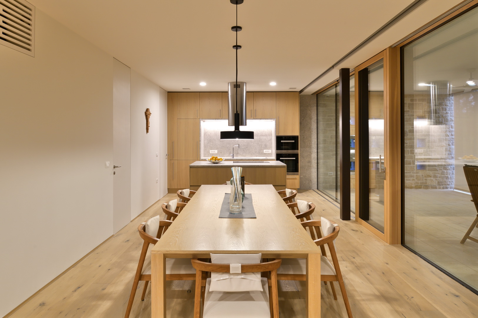 Tudi celotna zasnova hiše ostaja umirjena in pregledna. Enoten volumen se prilagaja le tam, kjer je to potrebno: pri vhodu se nekoliko umakne, da nastane nadkrit prostor za prihod, na zahodni strani pa se odpre v prostorno teraso, ki deluje kot naravno nadaljevanje dnevnega prostora.