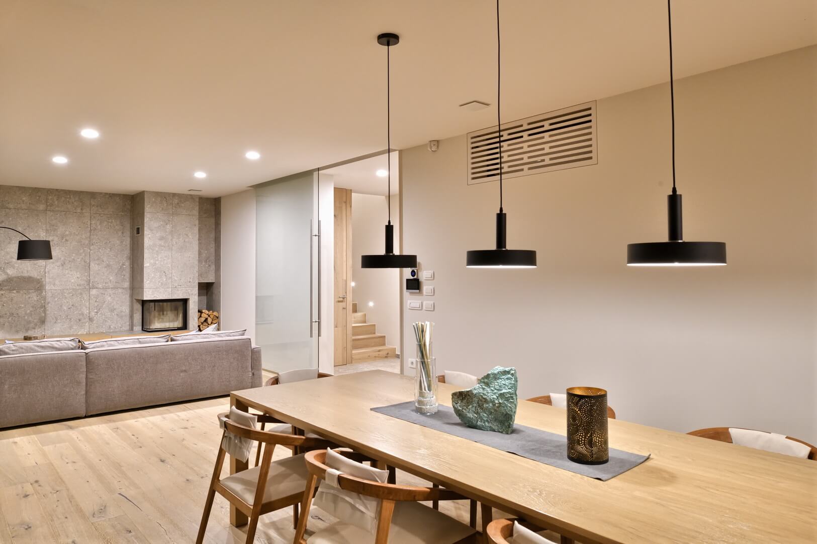 Pritličje je zasnovano kot odprt, povezan bivalni prostor. Ob vhodu se zvrstita predsoba in garderoba, nato se prostor razširi v dnevno sobo z jedilnico in kuhinjo, ki ji sledita še utility in kopalnica. Dnevni prostor se z velikimi steklenimi površinami odpira na prostorno, pokrito teraso, ki postane naravno nadaljevanje notranjega bivanja.