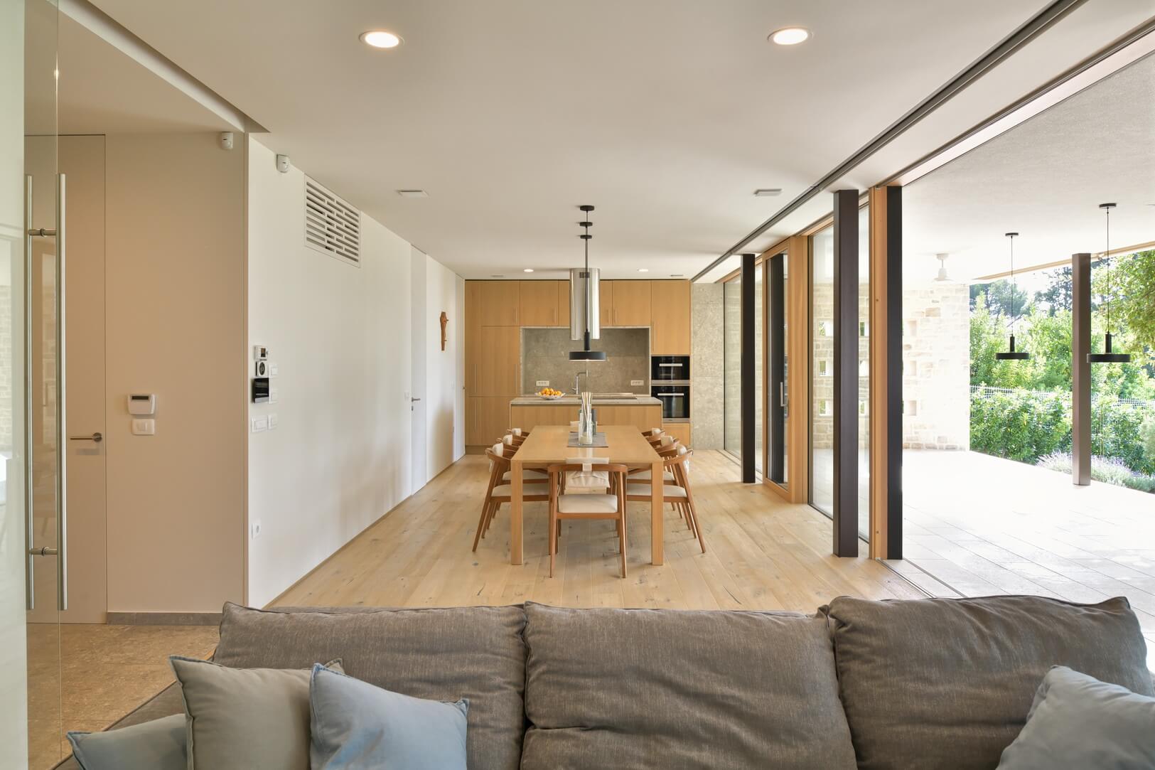 Arhitekturni koncept nove hiše temelji na preprostosti. »Skozi razvoj projekta se je izoblikovala jasna ideja enotnega volumna z odprtim dnevnim delom v pritličju. Ta se odpira proti zahodu in morju ter hkrati izkorišča naravno senco starega hrasta. Na vzhodni, zadnji strani hiše pa so ob pritličju nanizani servisni prostori, vhod in stopnišče, ki vodi v spalni del v nadstropju,« razkrije Tomaž Jelovšek.