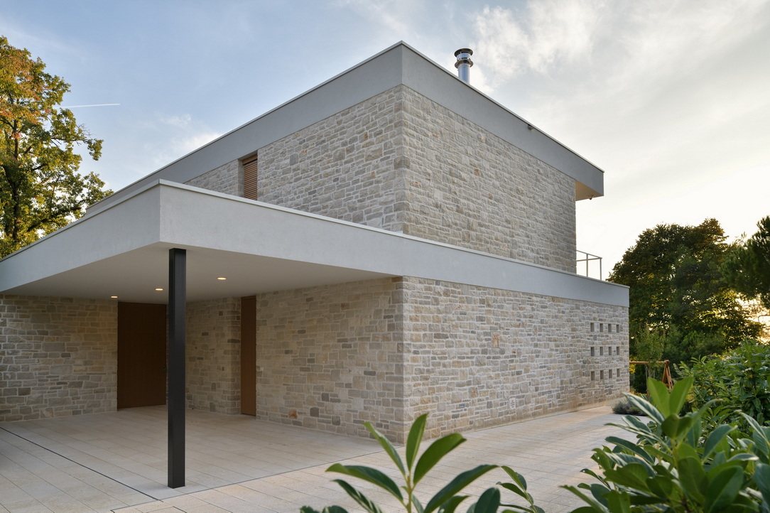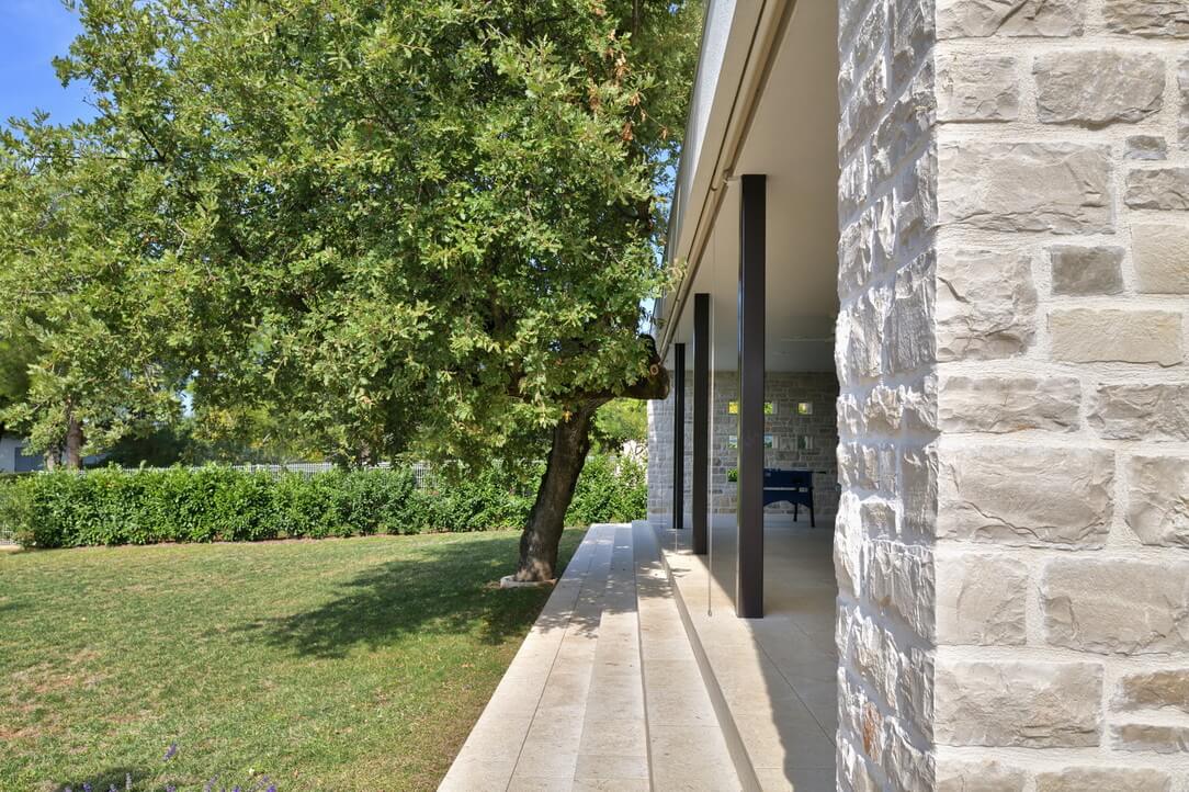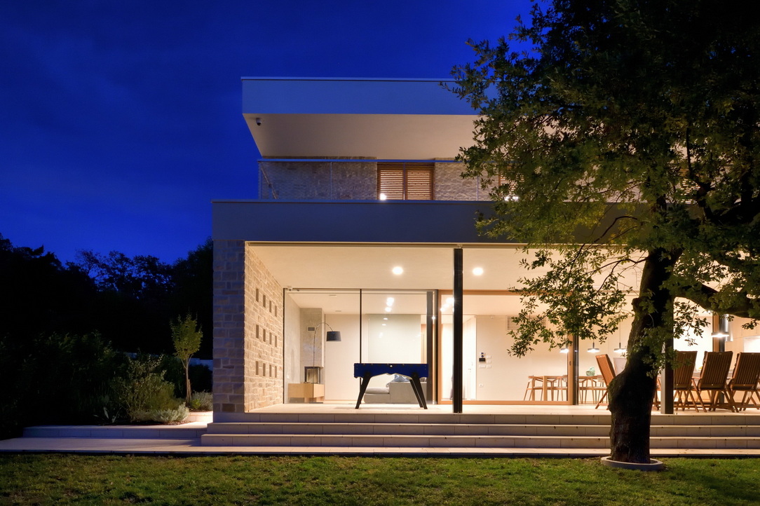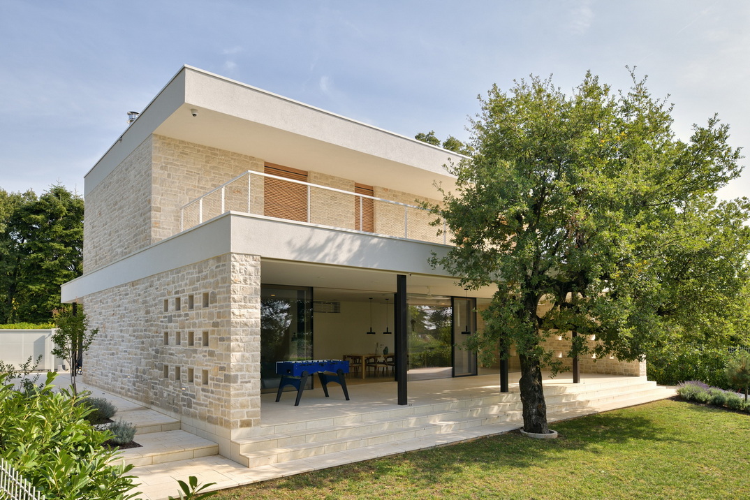 Konstrukcija objekta je klasična, a premišljena: armiranobetonski temelji, opečni nosilni zidovi in toplotna izolacija, zaključena z lokalnim istrskim kamnom kanfanar z območja Pazina, ki hišo trdno zasidra v prostor. Protiutež naravnemu kamnu je arhitekt dosegel z medetažnimi strešnimi ploskvami, ki se ponekod raztezajo čez celoten volumen in ščitijo terase, drugje pa zgolj rišejo robove in ustvarjajo senco.