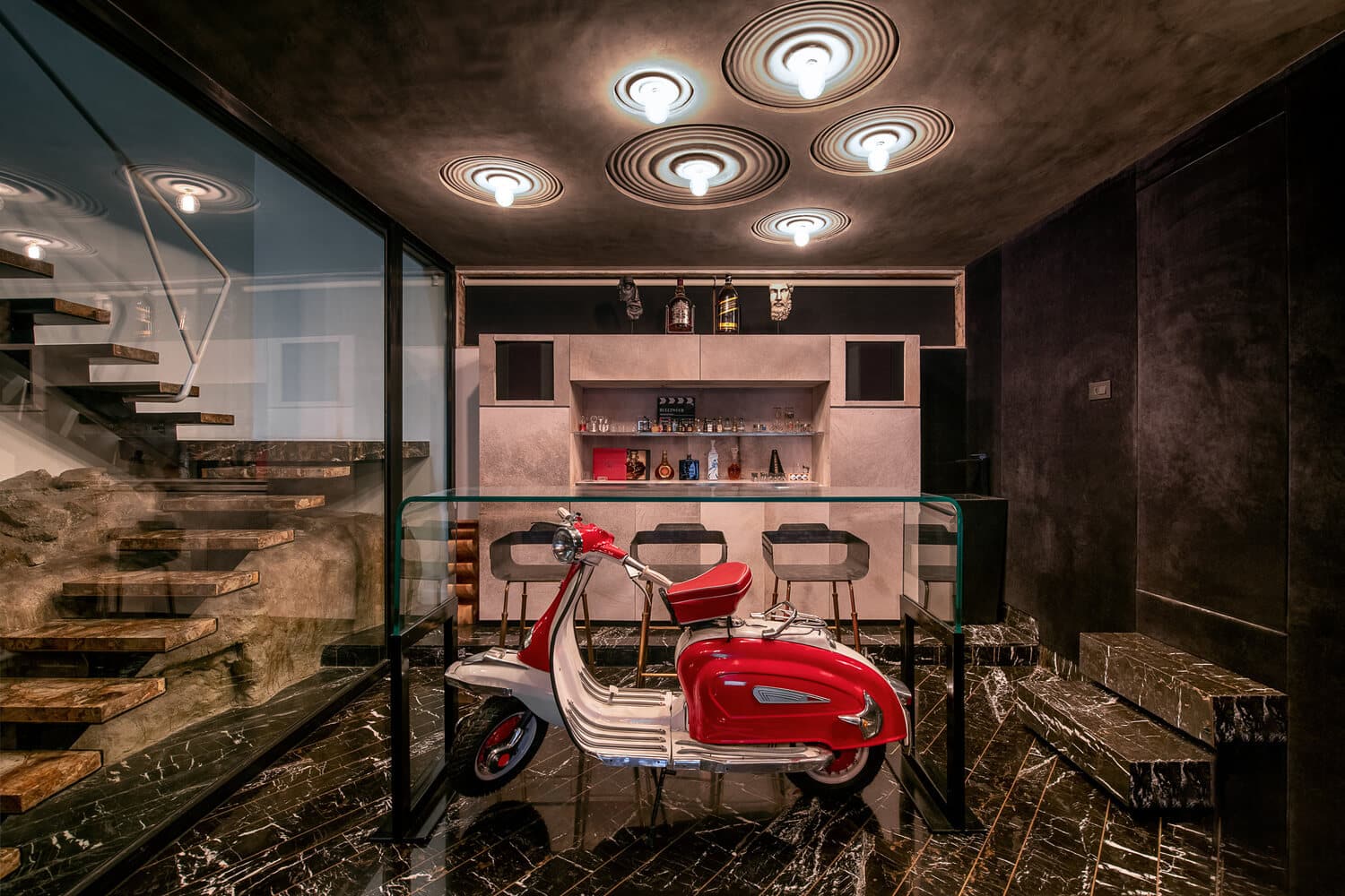 Na koncu pokukajmo še v klet, ki je v nasprotju z večino kletmi, kot jih poznamo, vredna ogleda. Vanjo je družina umestila domači kino in bar, kjer se radi zberejo, ko pridejo obiski, glavni magnet za oči pa je zagotovo restavriran lambretta skuter iz leta 1920, ki je pravi umetniški eksponat.