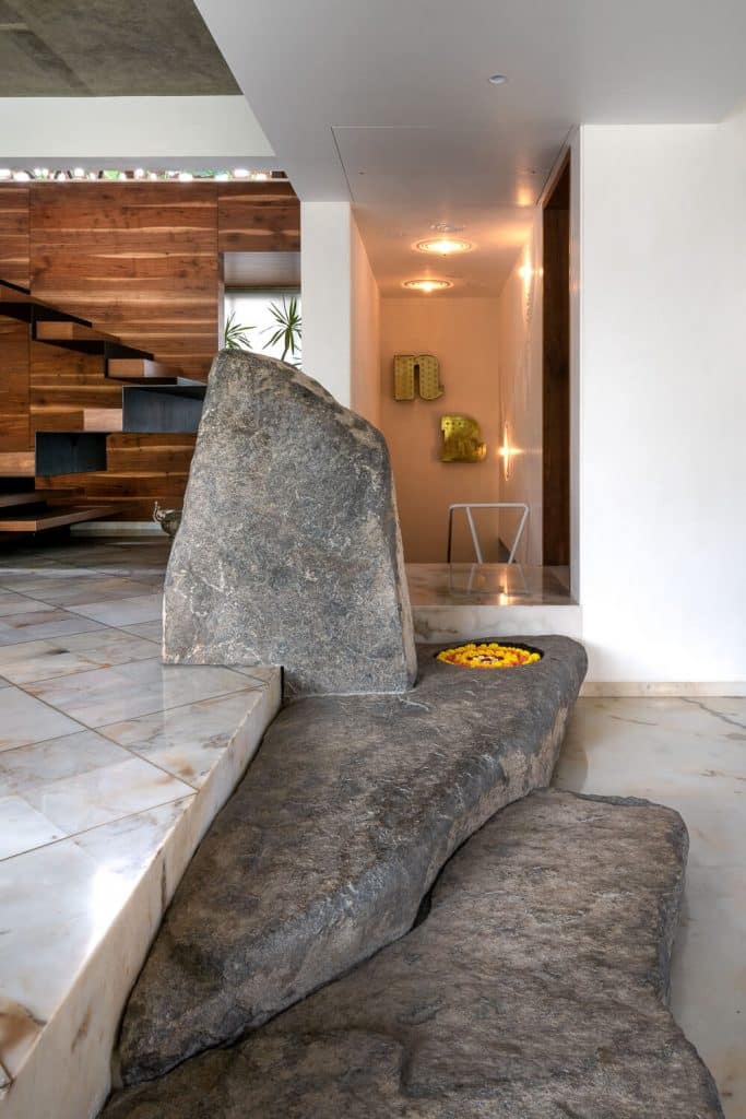 V hišo vstopimo skozi markantna, kar 6 metrov visoka vrata in se zagledamo v kamnite stopnice, ki nas takoj prizemljijo in povabijo v notranjost dnevnega prostora z zofo in valovito klubsko mizico znamke Boca do Lobo. Kamin je integriran v TV steno, udobni stoli pa kar vabijo k posedanju in počitku. Če je vreme prijetno, je zunaj tudi bazen, seveda dostopen iz dnevnega prostora.
