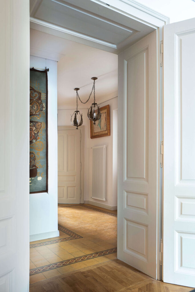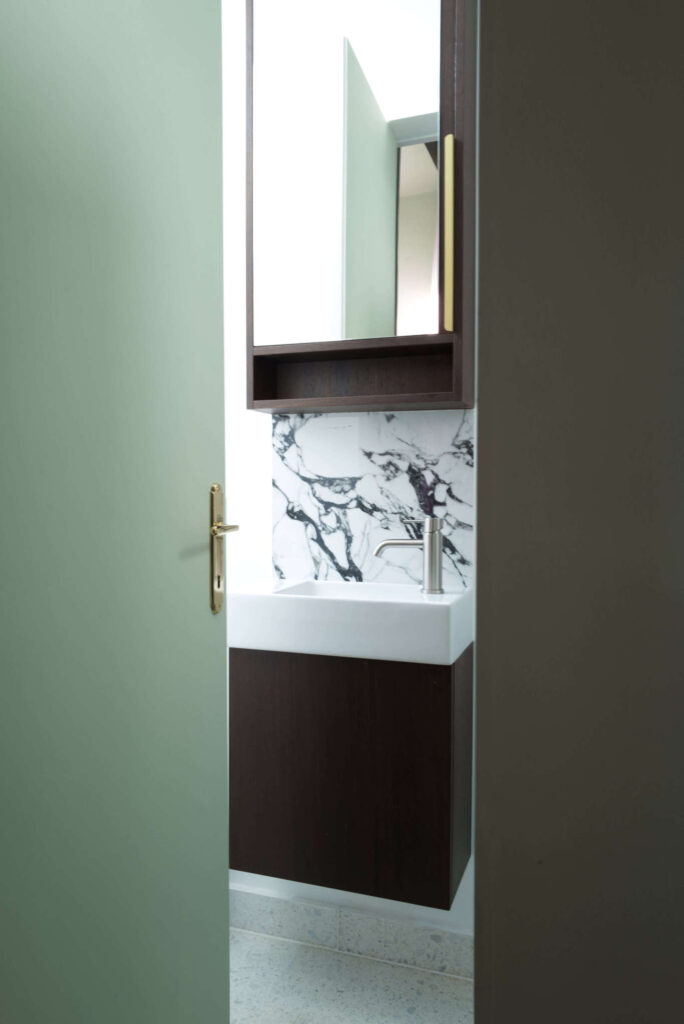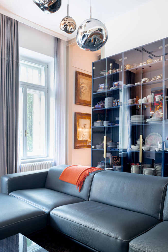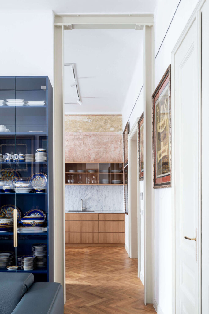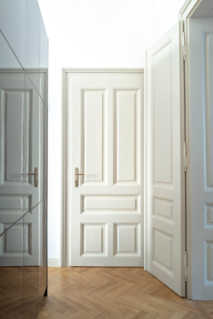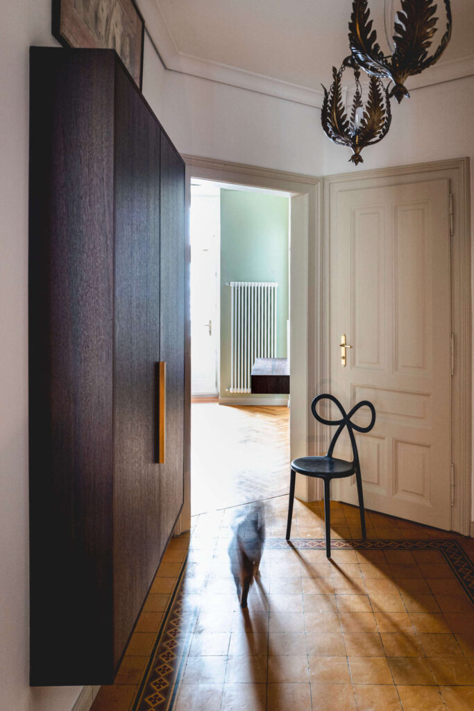 Posebno pozornost so arhitekti namenili detajlom po meri. Vgradne omare in pohištveni volumni so oblikovani kot samostojni arhitekturni elementi, ki prostor členijo, ne da bi ga zapirali. Temnejši, skoraj zrcalni površinski zaključki v spalnem delu subtilno reflektirajo prostor in svetlobo ter hkrati ustvarjajo občutek intime. Prehodi med prostori so poudarjeni z obstoječimi okvirji vrat, ki so bili skrbno obnovljeni in barvno prilagojeni novi celostni podobi stanovanja.