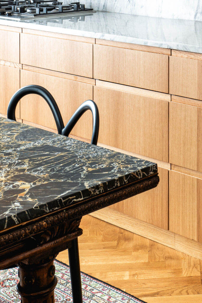 Eden od osrednjih posegov prenove je nova organizacija bivalnega dela. Kuhinja, jedilnica in dnevni prostor so povezani v enotno, odprto celoto, ki deluje svetlo in zračno, hkrati pa ohranja občutek razmejitve posameznih funkcij. Kuhinjski elementi so zasnovani kot natančno umeščeno pohištvo, ki se z materialnostjo in proporci navezuje na obstoječi prostor. Lesene fronte, kamnite in keramične površine ter umirjena barvna paleta ustvarjajo nevpadljivo, a izrazito materialno bogato ozadje vsakdanjega bivanja.