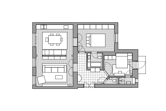 Osnovno vodilo prenove je bilo ohraniti značaj staromeščanskega tlorisa, obenem pa ga prilagoditi današnjim bivalnim navadam. Arhitekti so se zavestno izognili radikalnim posegom v konstrukcijo in prostorsko zasnovo ter namesto tega posegli po strategiji subtilnih intervencij. Prostor so odprli tam, kjer je to omogočalo boljšo funkcionalnost in pretočnost, ob tem pa ohranili ključne arhitekturne elemente – originalna vrata, stavbno pohištvo, parket in višino prostorov, ki ostajajo nosilci identitete stanovanja.