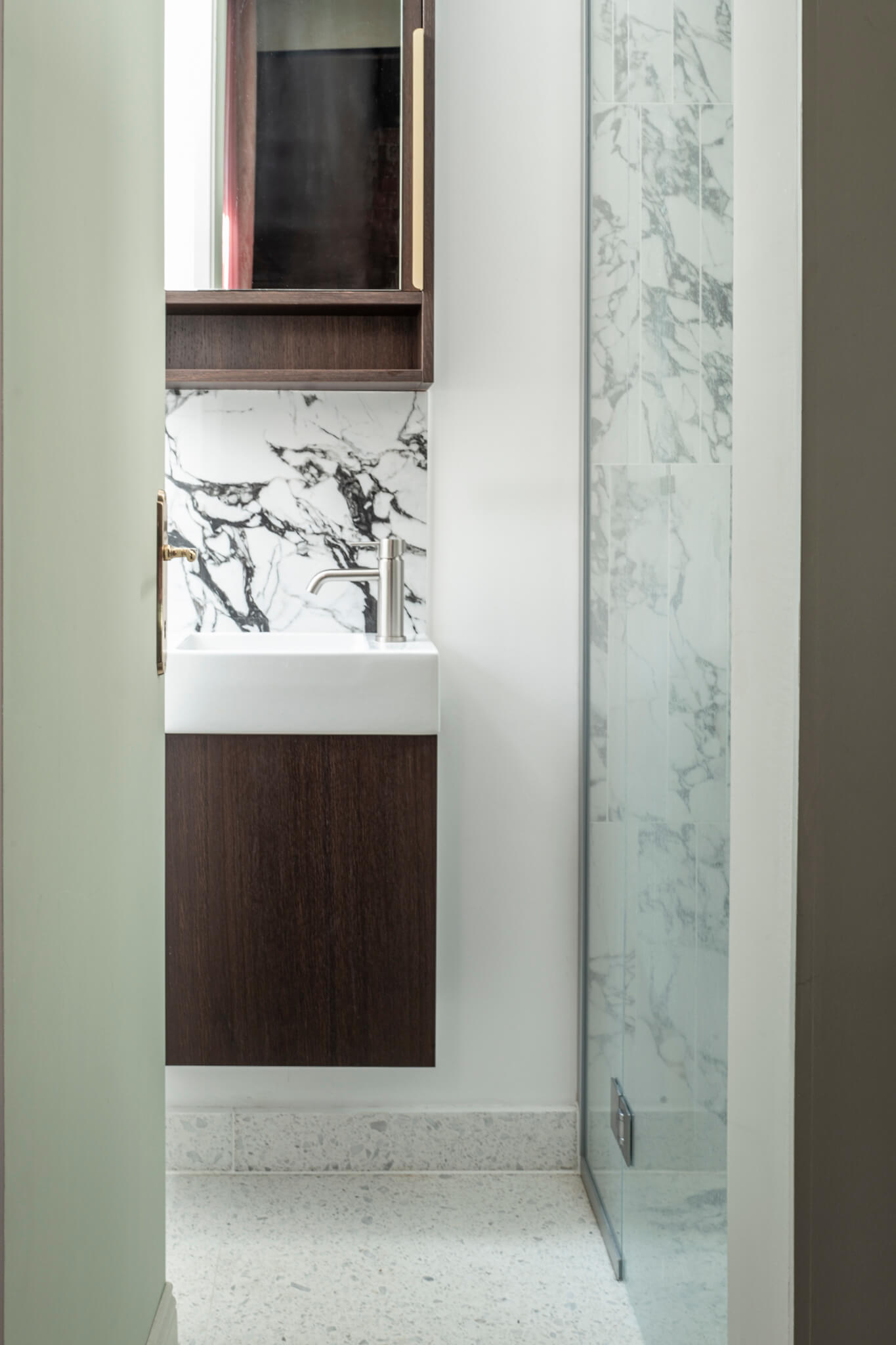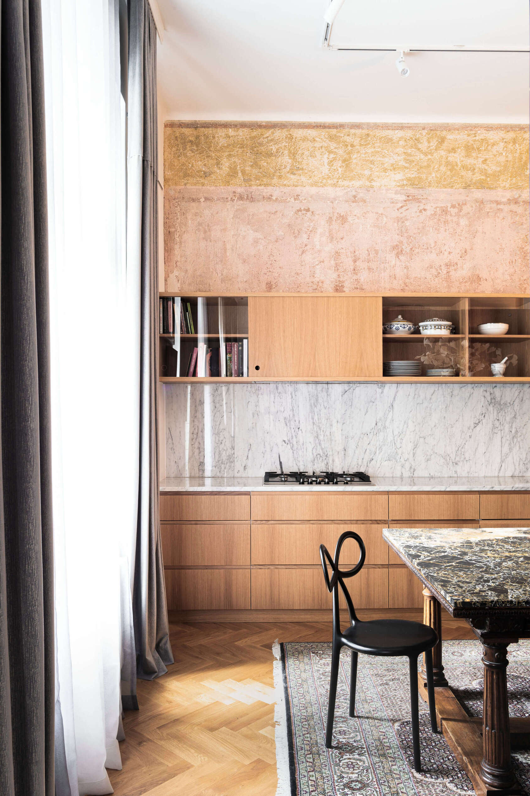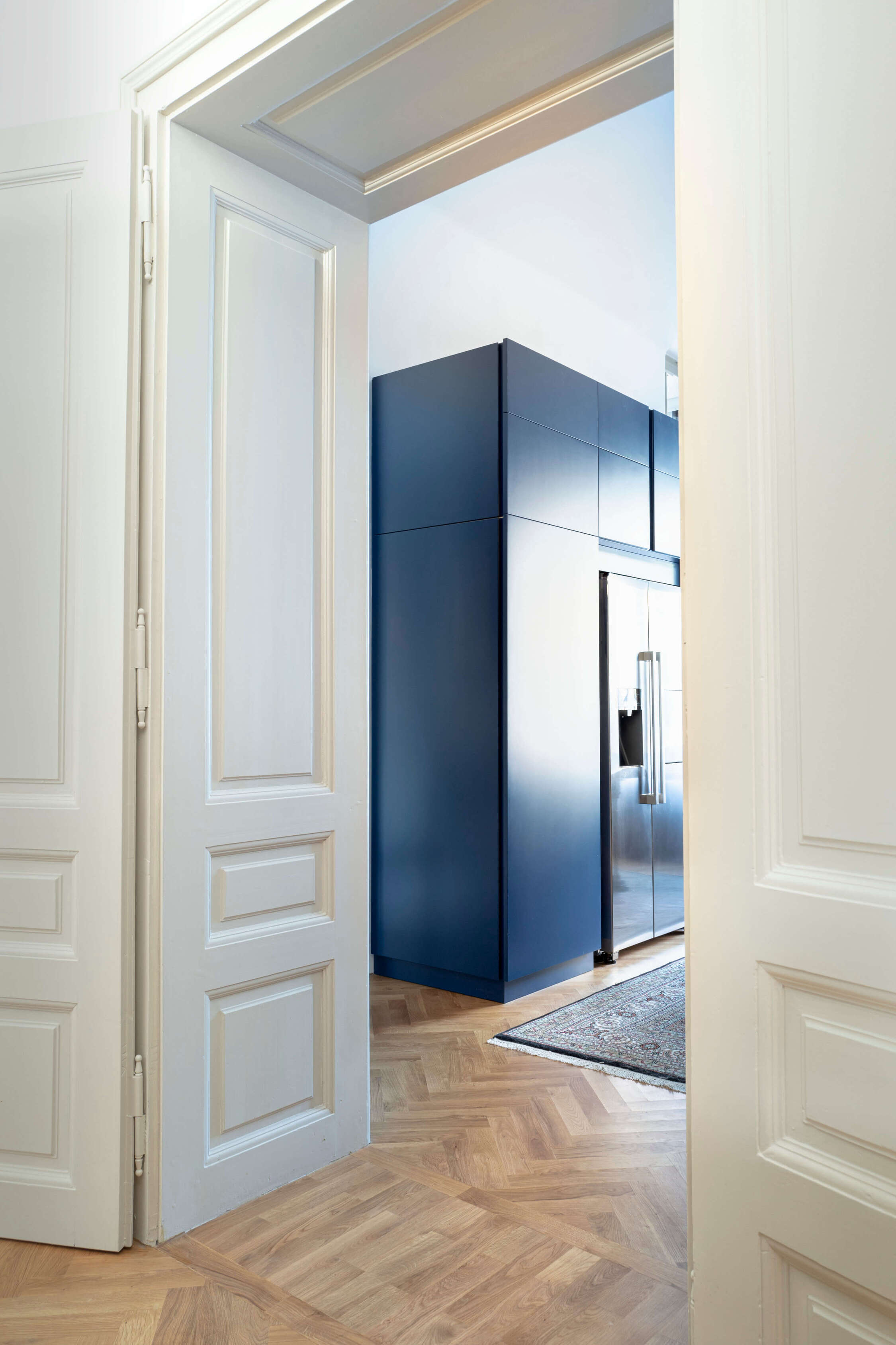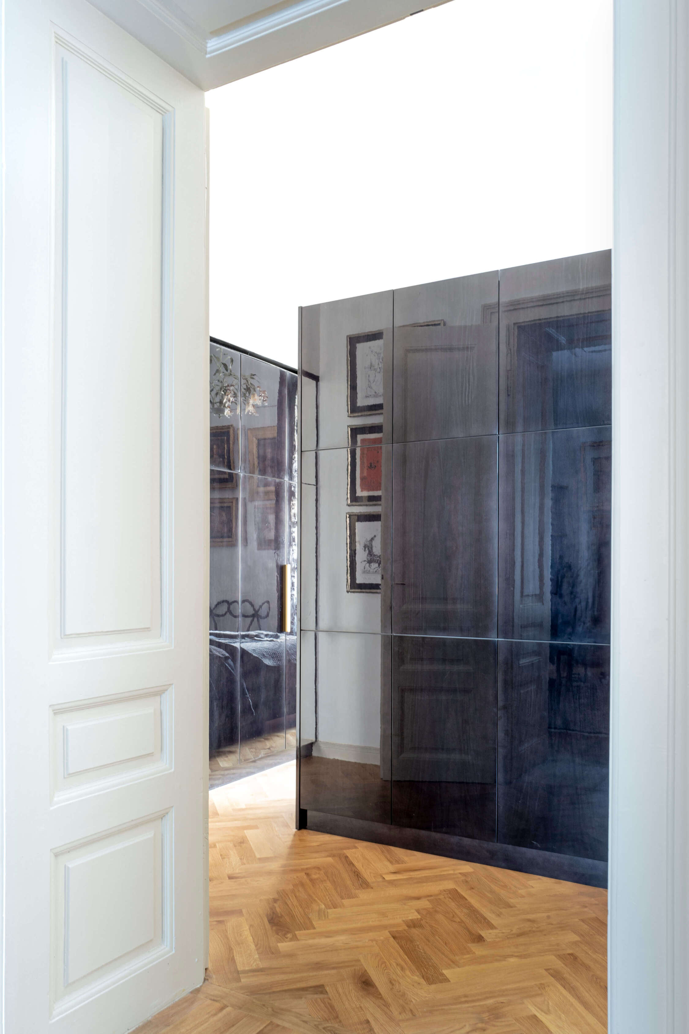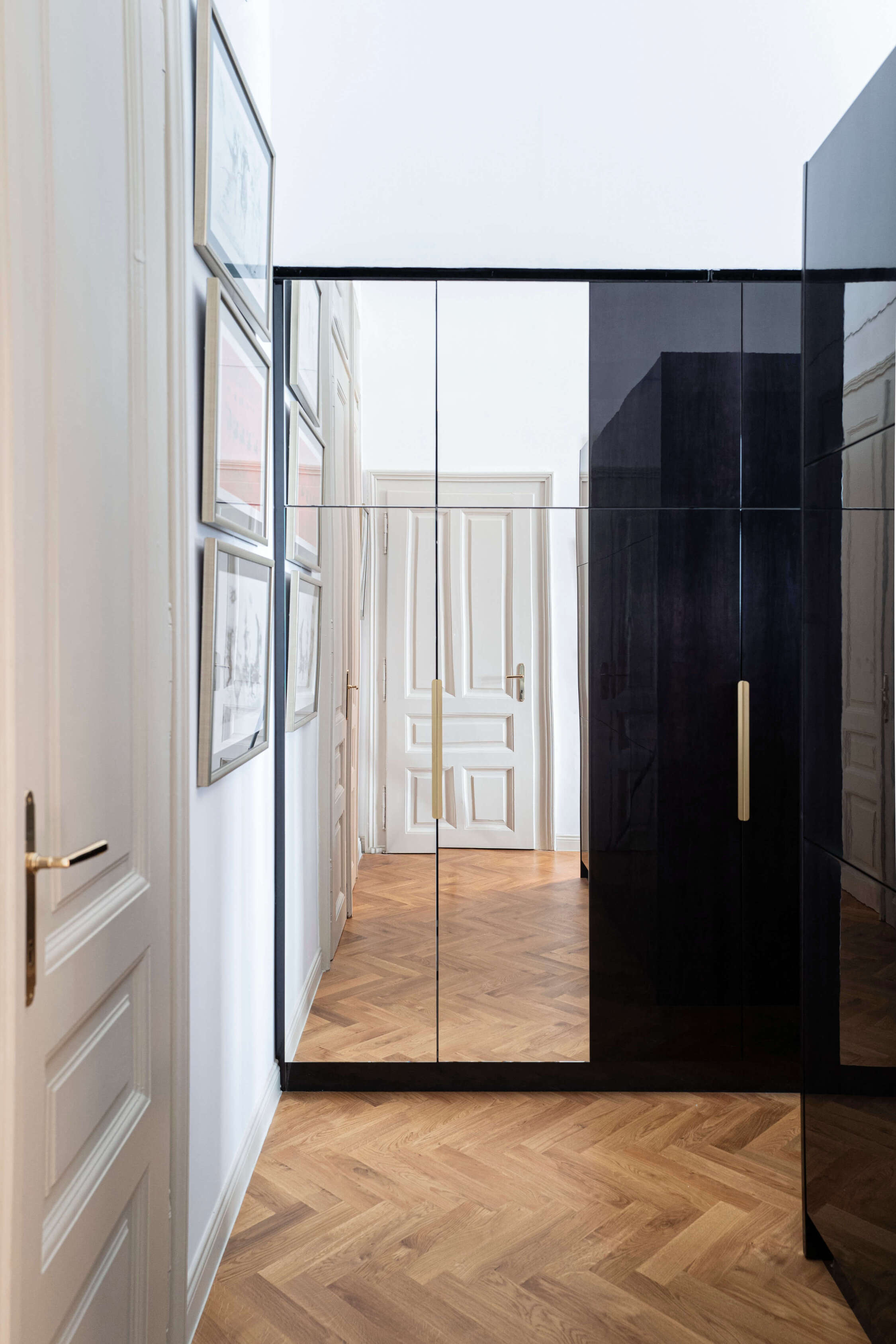 Posebno pozornost so arhitekti namenili detajlom po meri. Vgradne omare in pohištveni volumni so oblikovani kot samostojni arhitekturni elementi, ki prostor členijo, ne da bi ga zapirali. Temnejši, skoraj zrcalni površinski zaključki v spalnem delu subtilno reflektirajo prostor in svetlobo ter hkrati ustvarjajo občutek intime. Prehodi med prostori so poudarjeni z obstoječimi okvirji vrat, ki so bili skrbno obnovljeni in barvno prilagojeni novi celostni podobi stanovanja.