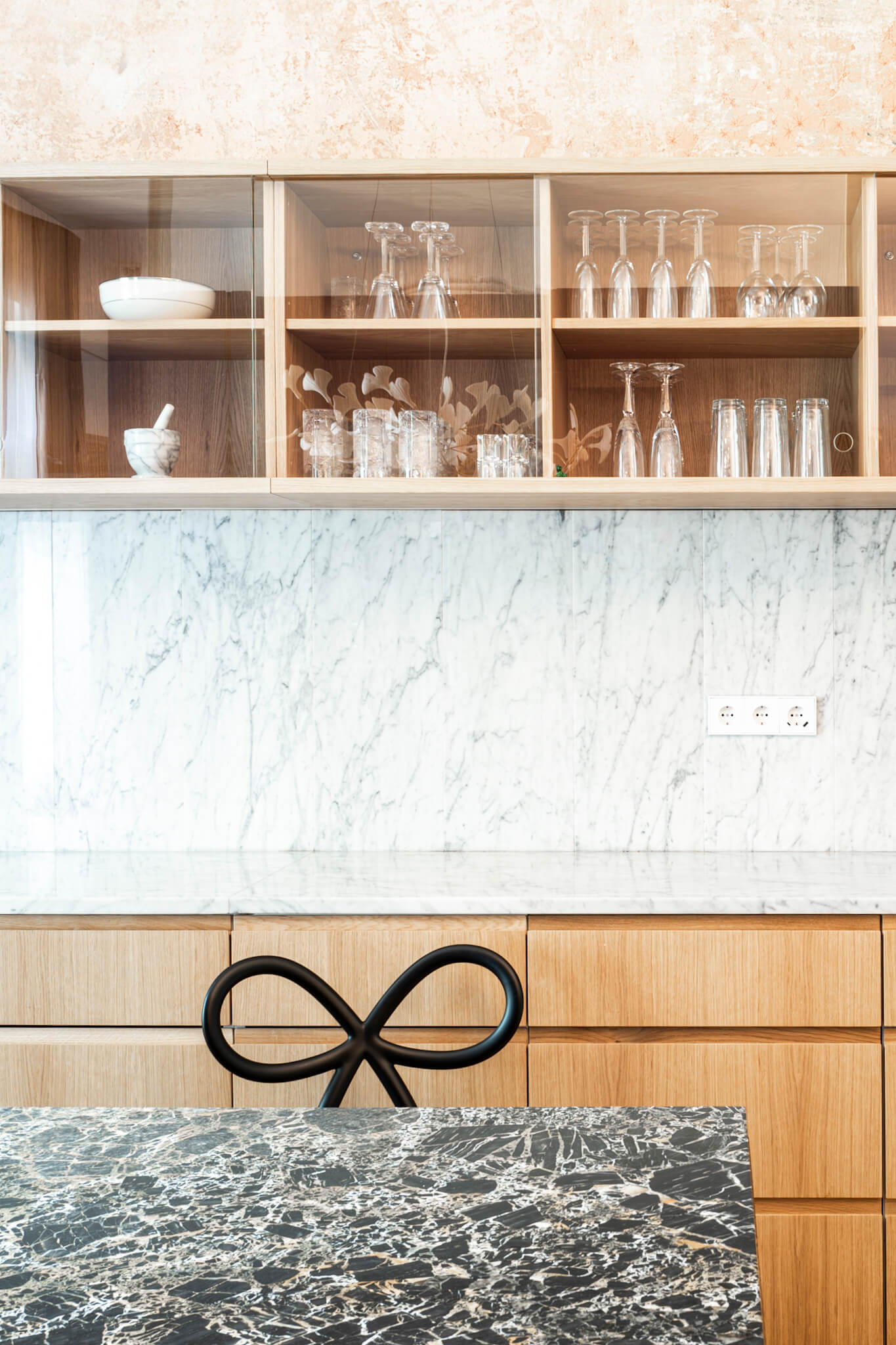 Eden od osrednjih posegov prenove je nova organizacija bivalnega dela. Kuhinja, jedilnica in dnevni prostor so povezani v enotno, odprto celoto, ki deluje svetlo in zračno, hkrati pa ohranja občutek razmejitve posameznih funkcij. Kuhinjski elementi so zasnovani kot natančno umeščeno pohištvo, ki se z materialnostjo in proporci navezuje na obstoječi prostor. Lesene fronte, kamnite in keramične površine ter umirjena barvna paleta ustvarjajo nevpadljivo, a izrazito materialno bogato ozadje vsakdanjega bivanja.