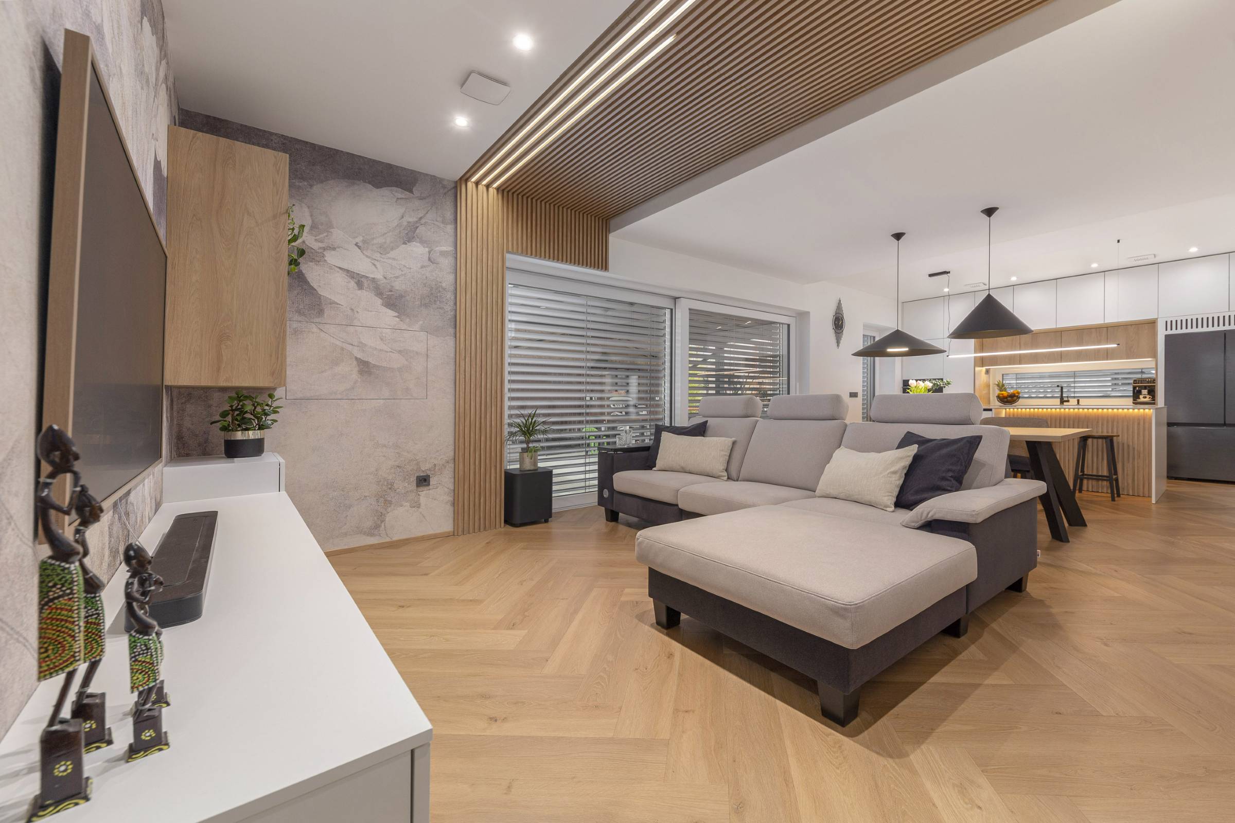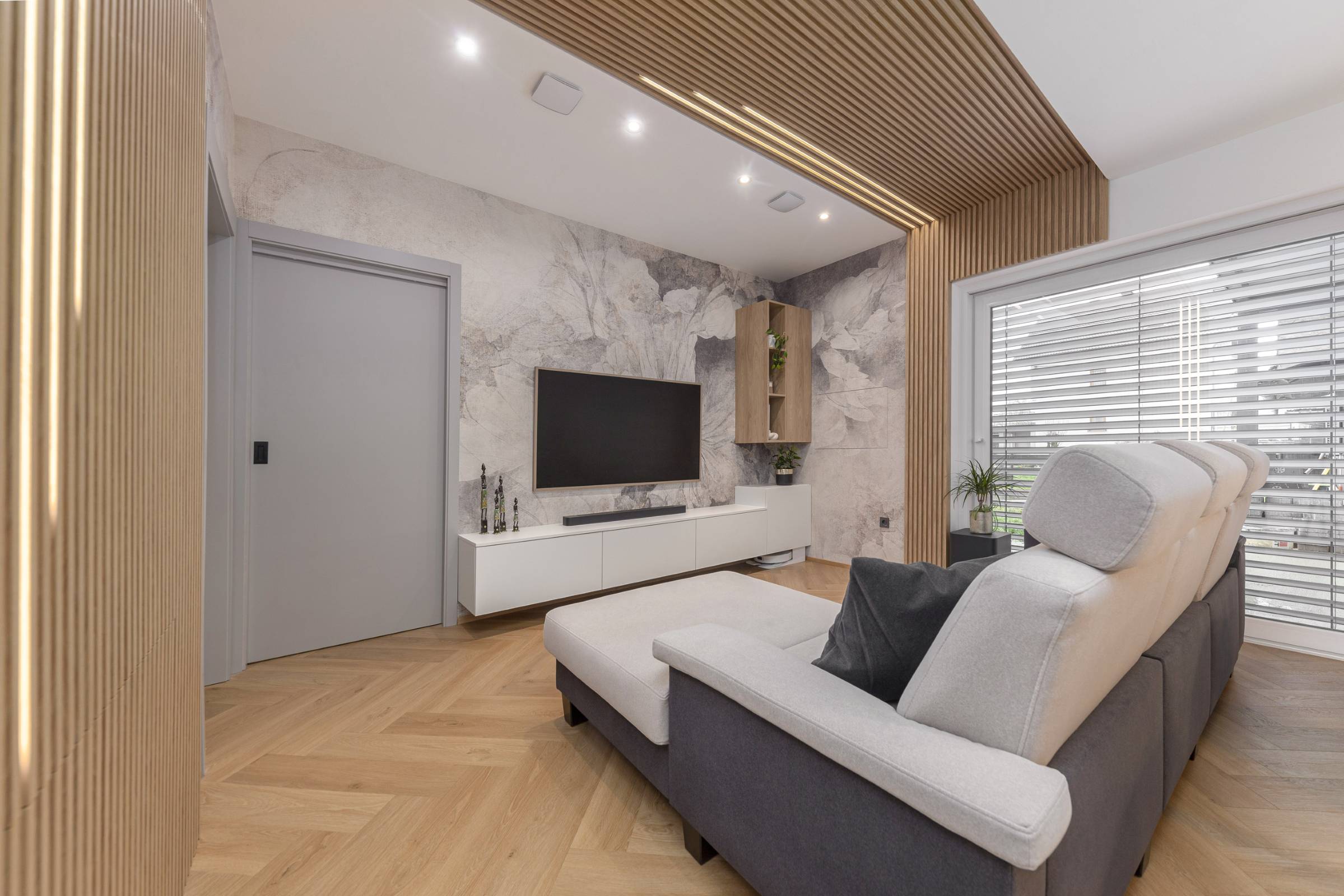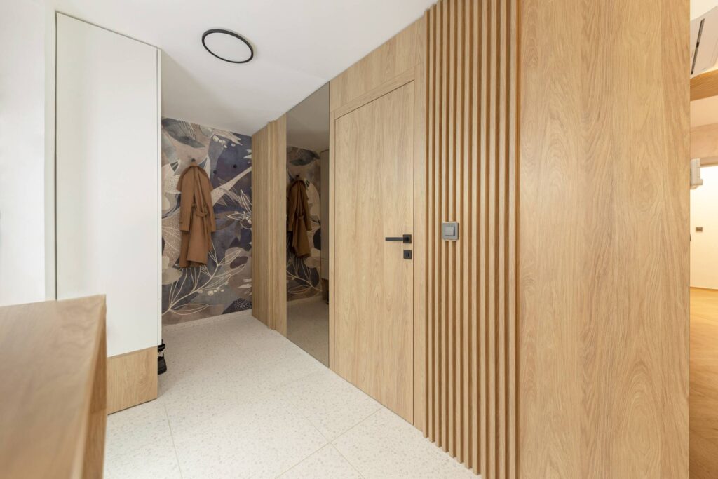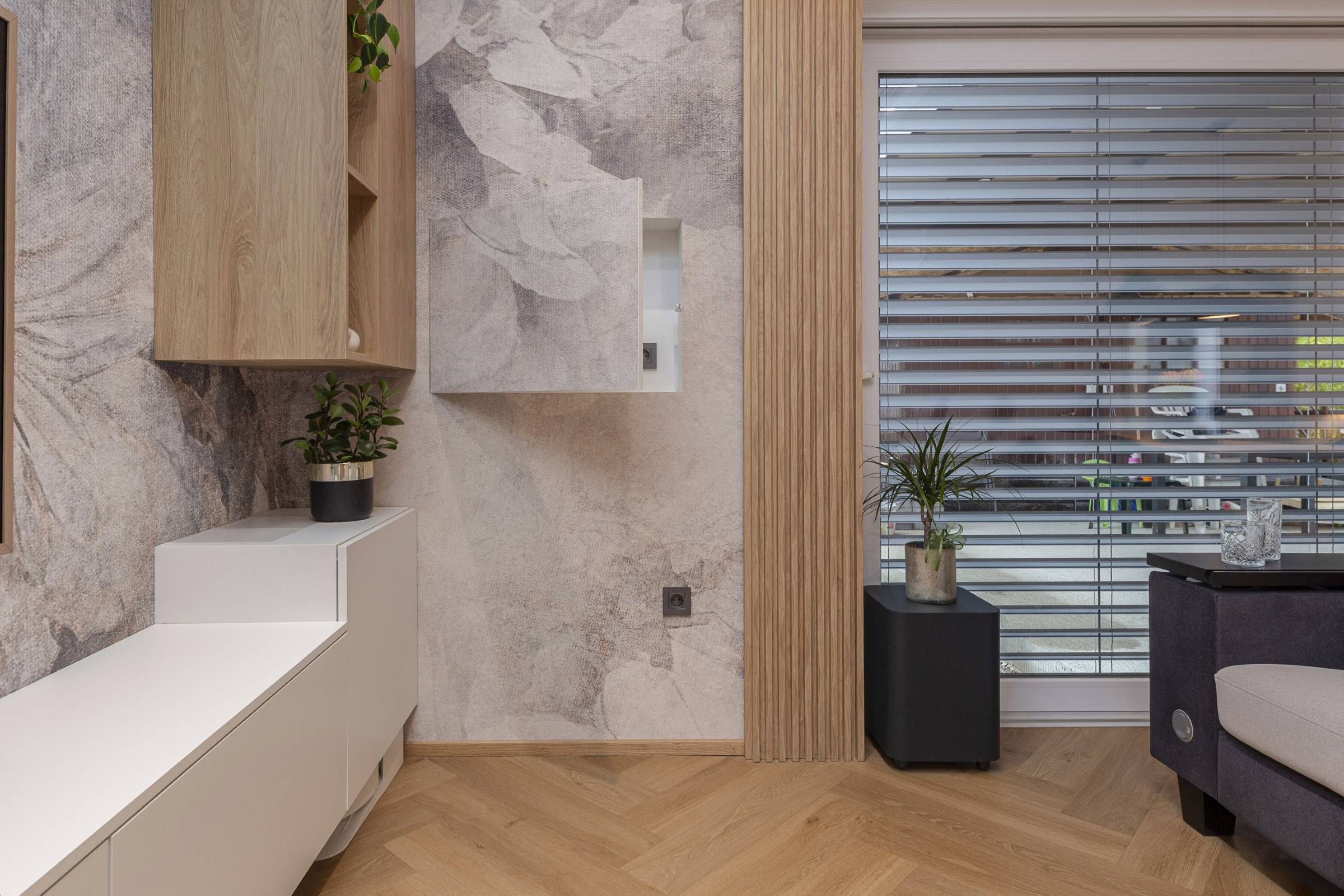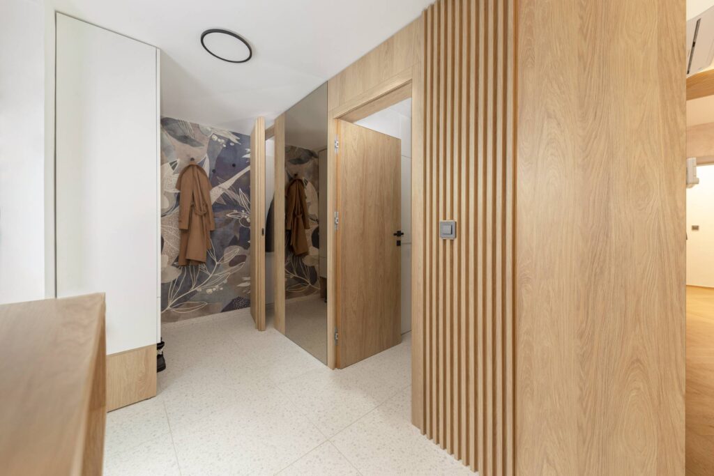 Interjer temelji na uporabi toplih, naravnih materialov, predvsem lesa, ki prostoru daje občutek domačnosti. Lesena stenska obloga poleg estetike vključuje še diskretno integrirane funkcionalne elemente, kot je vhod v shrambo, ki ostaja na prvi pogled neopazen.