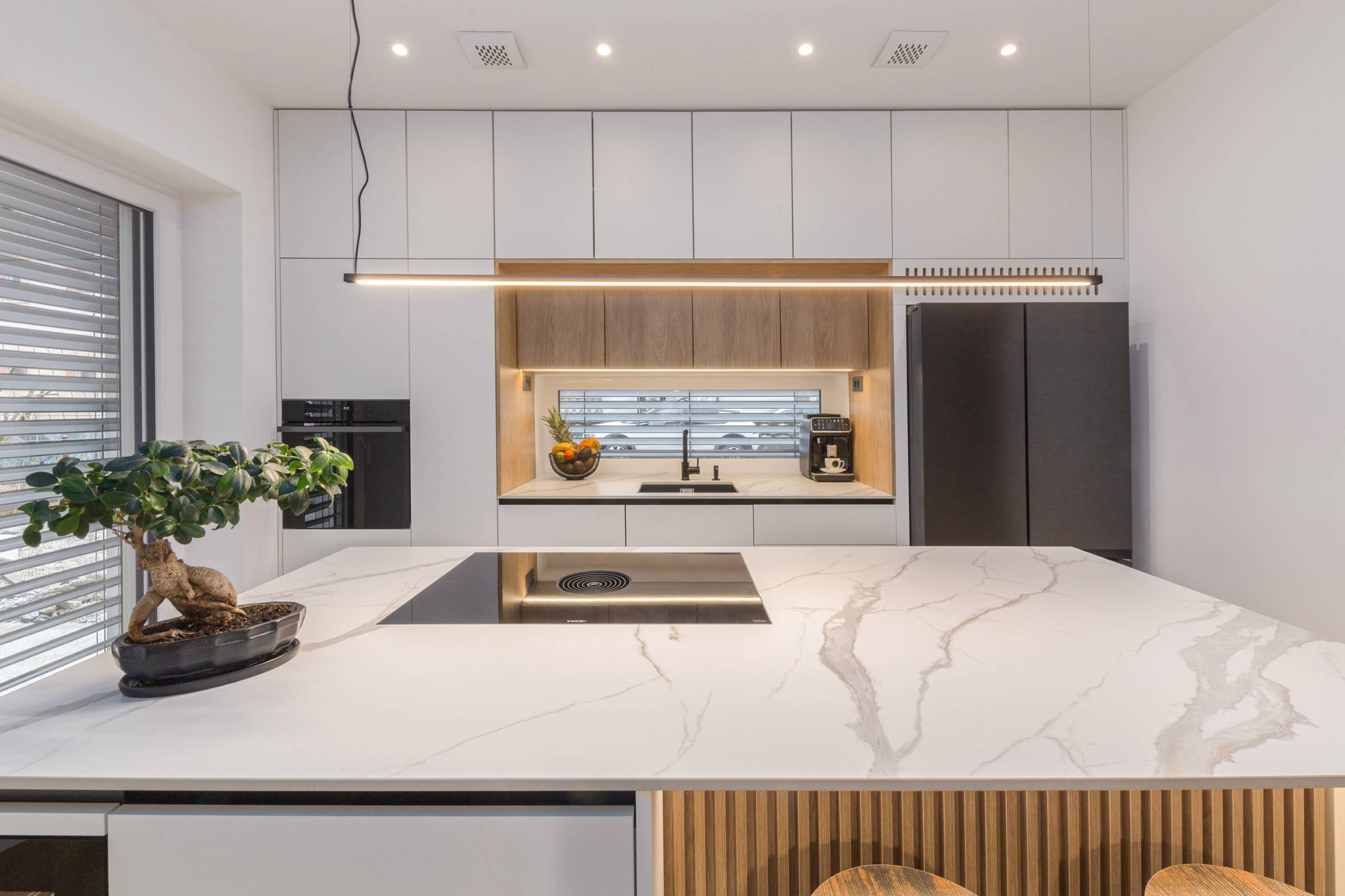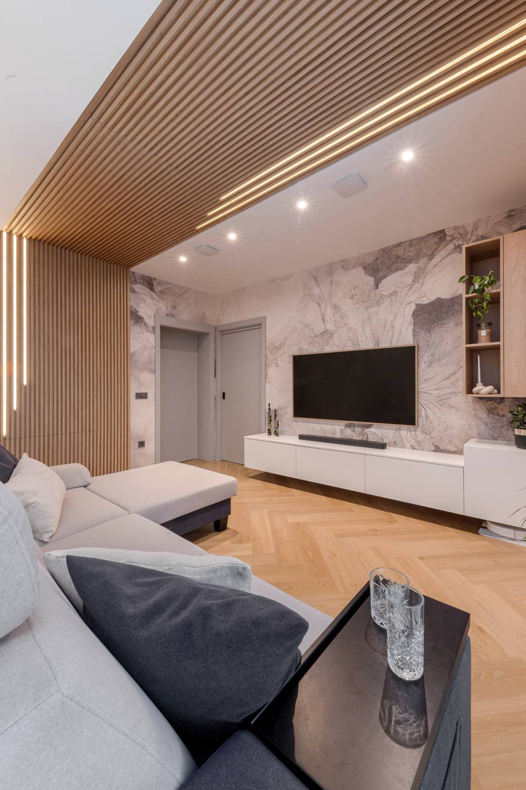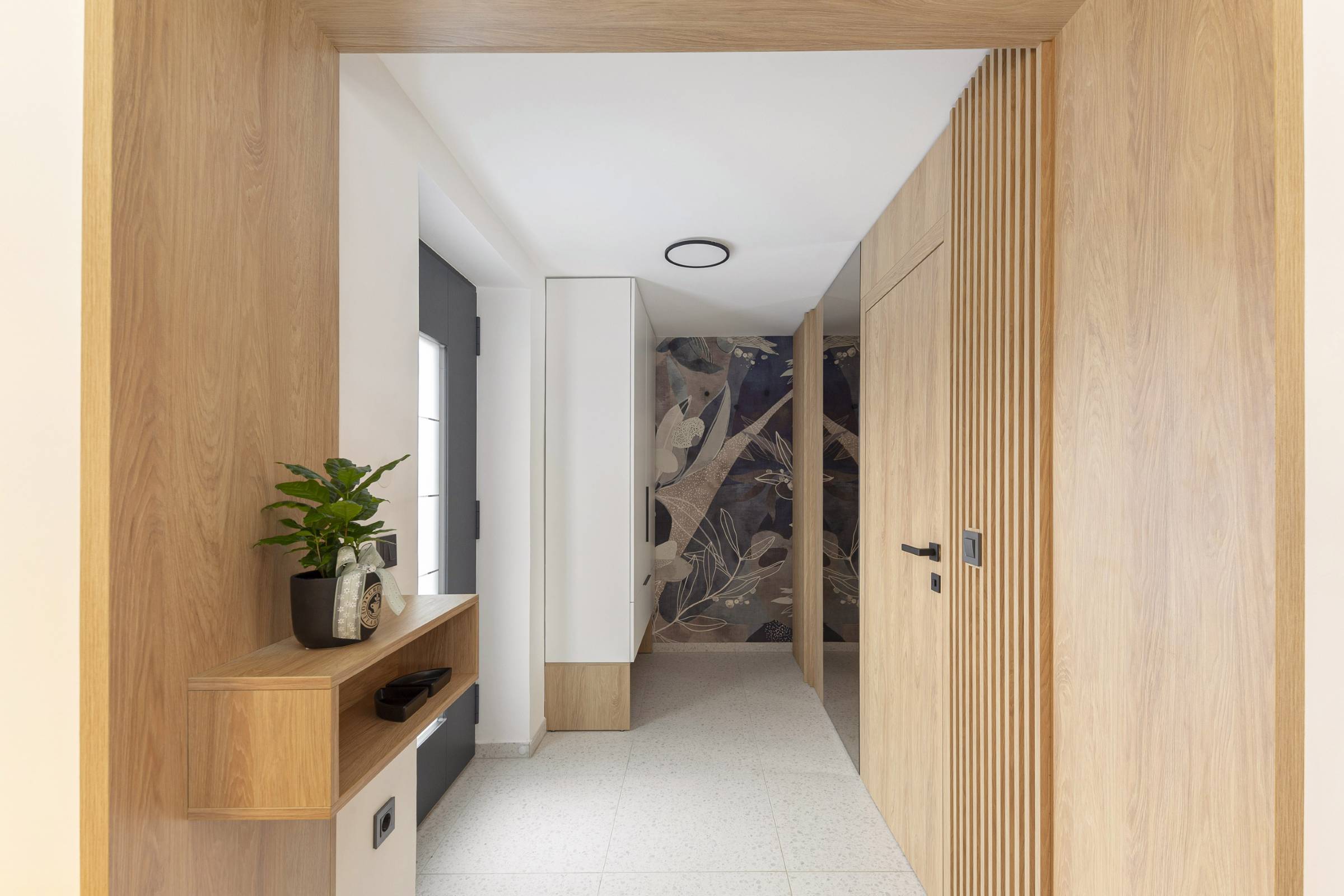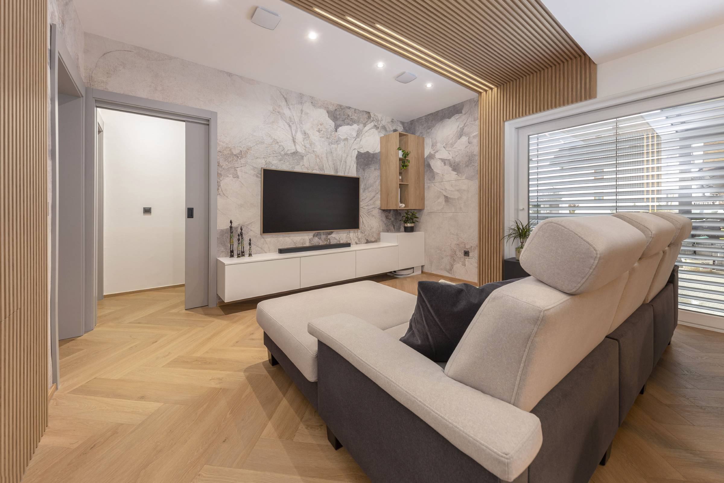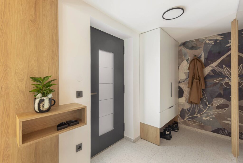 Interjer temelji na uporabi toplih, naravnih materialov, predvsem lesa, ki prostoru daje občutek domačnosti. Lesena stenska obloga poleg estetike vključuje še diskretno integrirane funkcionalne elemente, kot je vhod v shrambo, ki ostaja na prvi pogled neopazen.