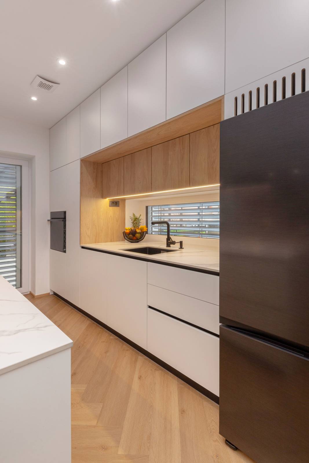 Osnovni bivalni prostor je izrazito podolgovate oblike, dodatni izziv pa so predstavljali stropni nosilci, ki so nujni za konstrukcijsko stabilnost objekta. Kot odgovor na to so zasnovali lesen stenski element, ki se neprekinjeno nadaljuje na strop in se zaključi na nasprotni strani prostora. Ta element ima večplastno vlogo: vizualno ločuje dnevni prostor od kuhinje in jedilnice, zakriva konstrukcijske elemente in hkrati optično skrajša prostor, kar ustvarja bolj uravnoteženo in prijetno prostorsko izkušnjo.
