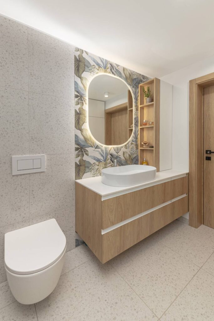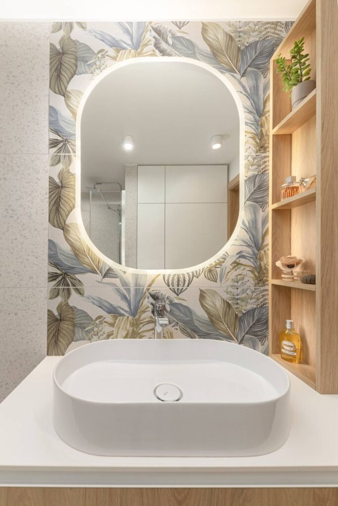 Posebno pozornost so namenili tudi izbiri drugih stenskih oblog. Klasične bele stene so na določenih mestih nadomestili s tapetami, že na vhodu obiskovalca na primer pozdravi živahna tapeta, ki se smiselno navezuje na leseno oblogo in ustvarja prijeten prvi vtis. V osrednjem bivalnem prostoru mehka tapeta z nežnimi barvnimi prehodi in organskimi linijami prispeva k sproščujočemu vzdušju, medtem ko keramika z rastlinskimi vzorci v kopalnici prostor subtilno poživi in mu doda svežino.